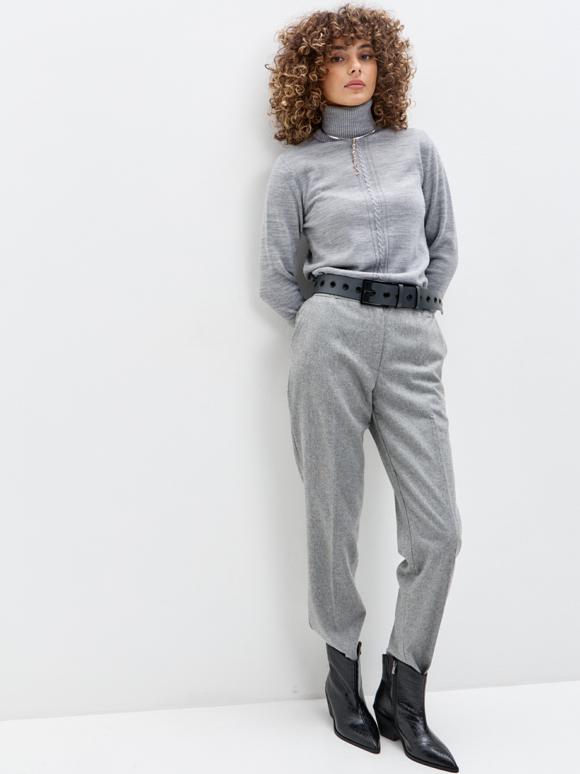 Посадка талевая, силуэт свободный по бедру и сужается к низу, свободно облегая ноги. Эластичный пояс аккуратно обхватывает талию, без давления. Брюки застёгиваются на молнию и кнопку/крючок. Удобные карманы с отрезным бочком, отутюженные стрелки добавляют вертикаль.