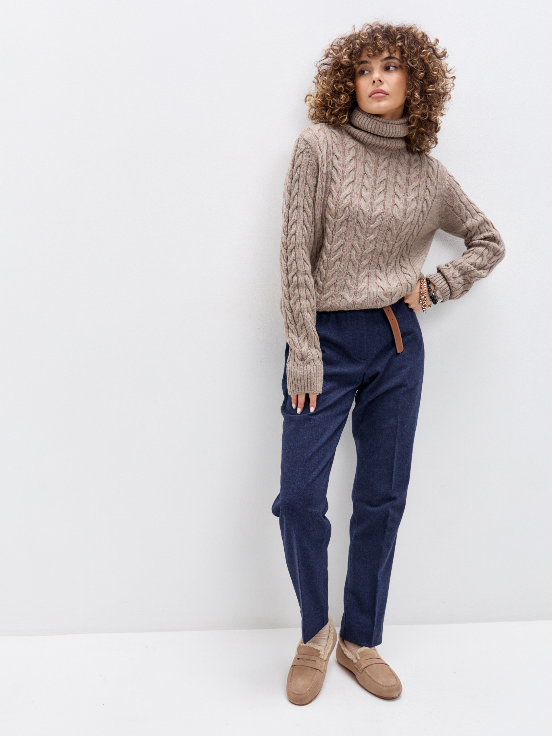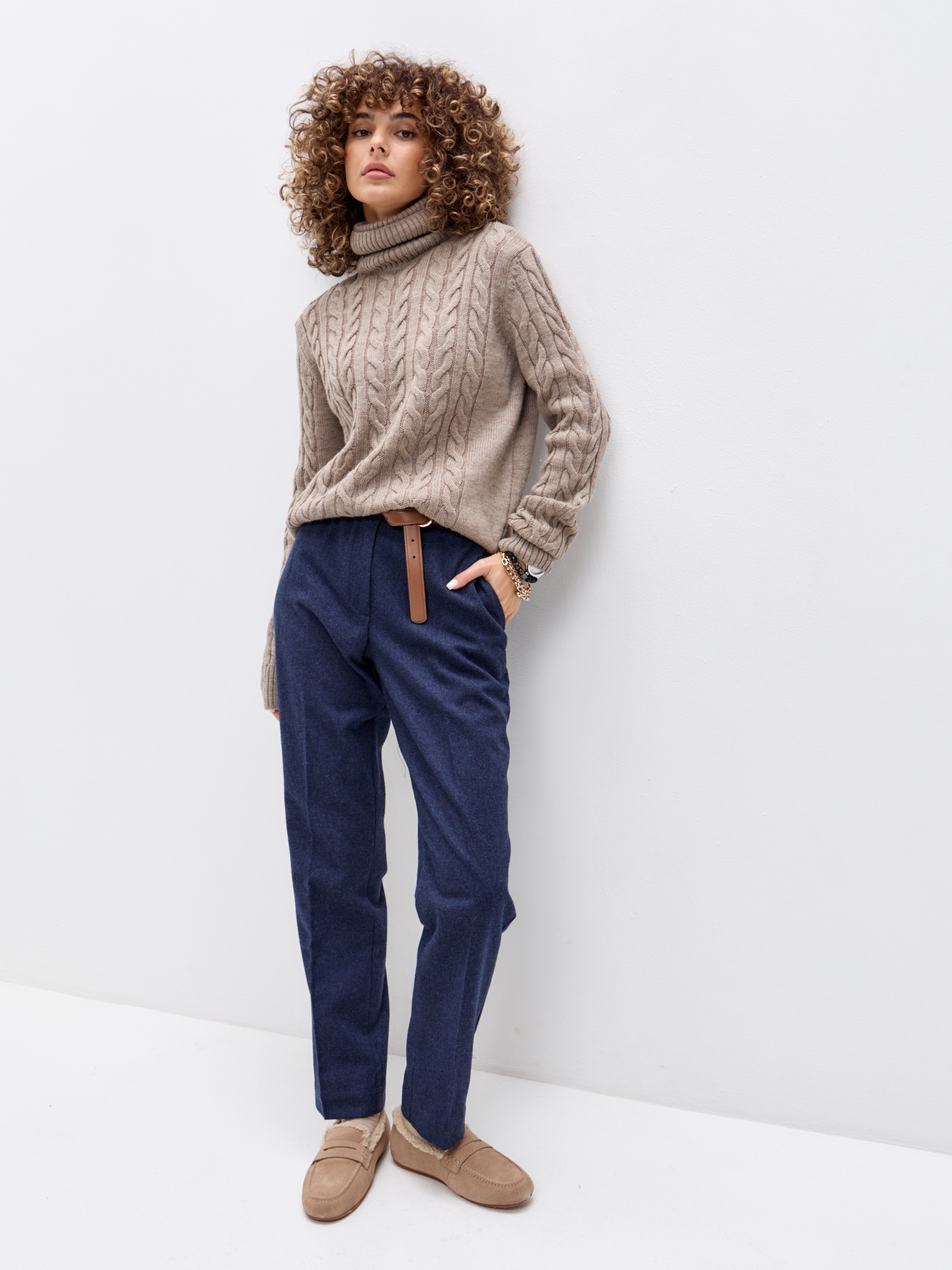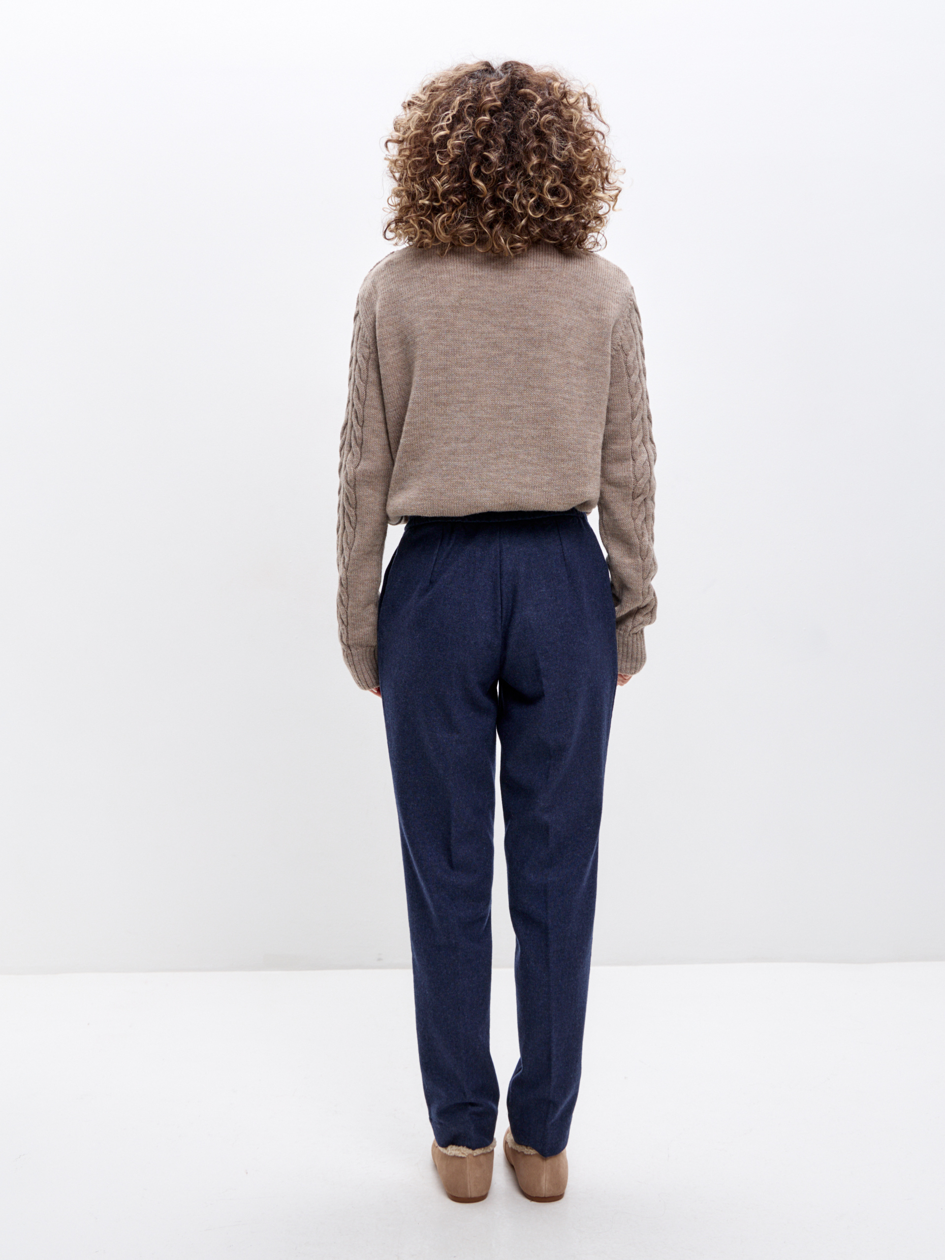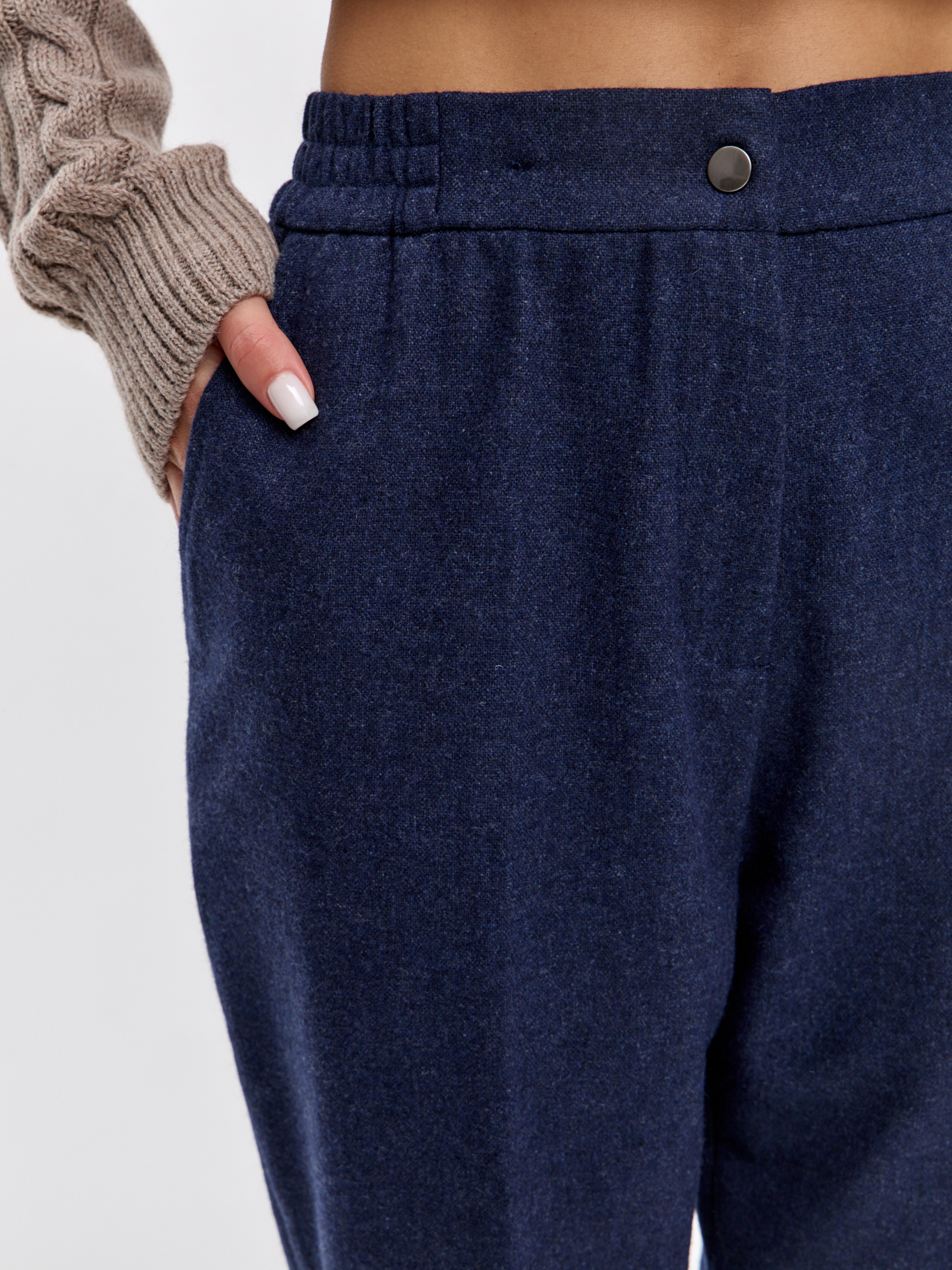 Брюки спереди на подкладке из вискозы. Посадка талевая, силуэт свободный по бедру и сужается к низу. Эластичный пояс аккуратно обхватывает талию, без давления. Брюки застёгиваются на молнию и кнопку/крючок. Удобные карманы с отрезным бочком, отутюженные стрелки добавляют вертикаль.