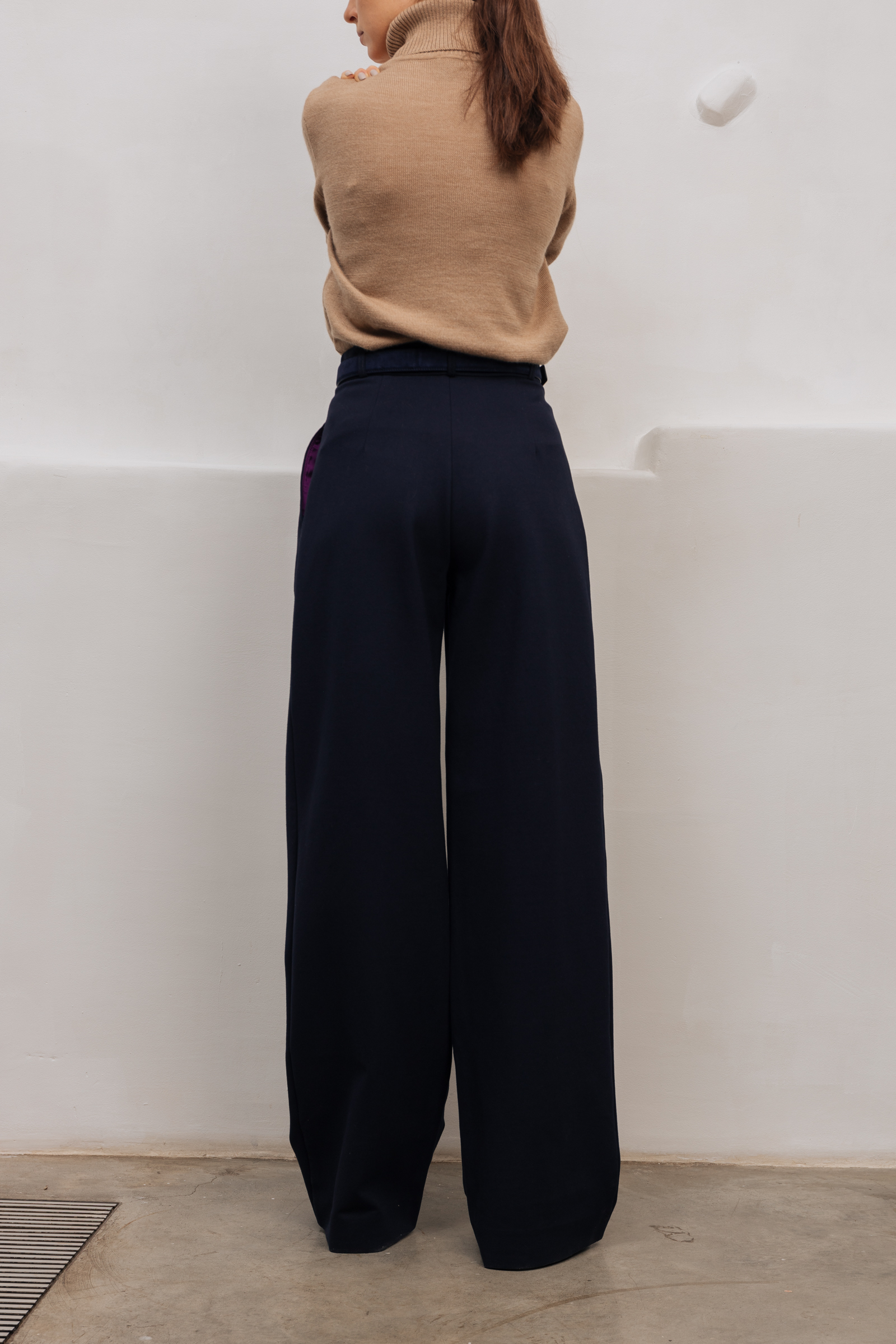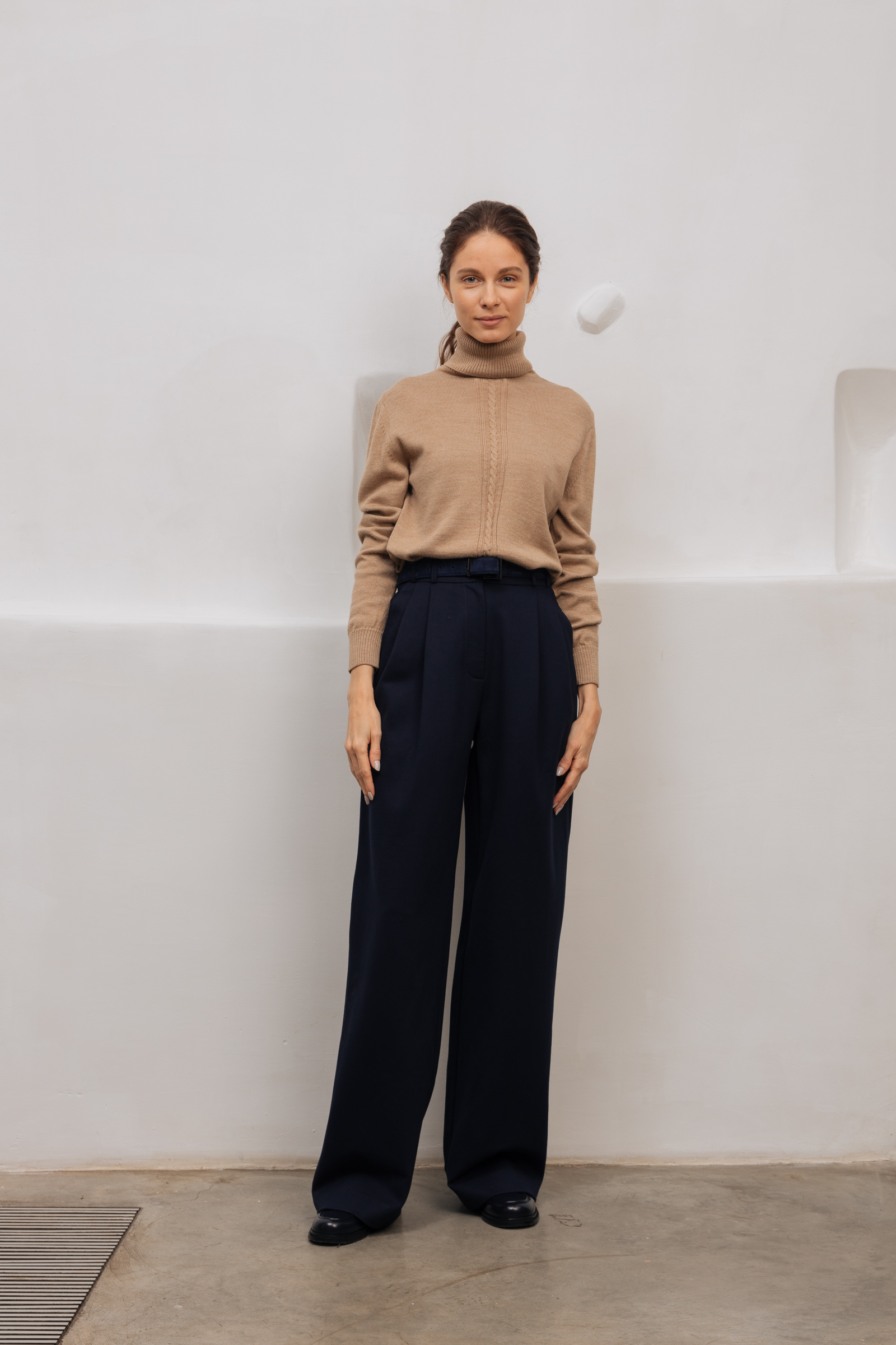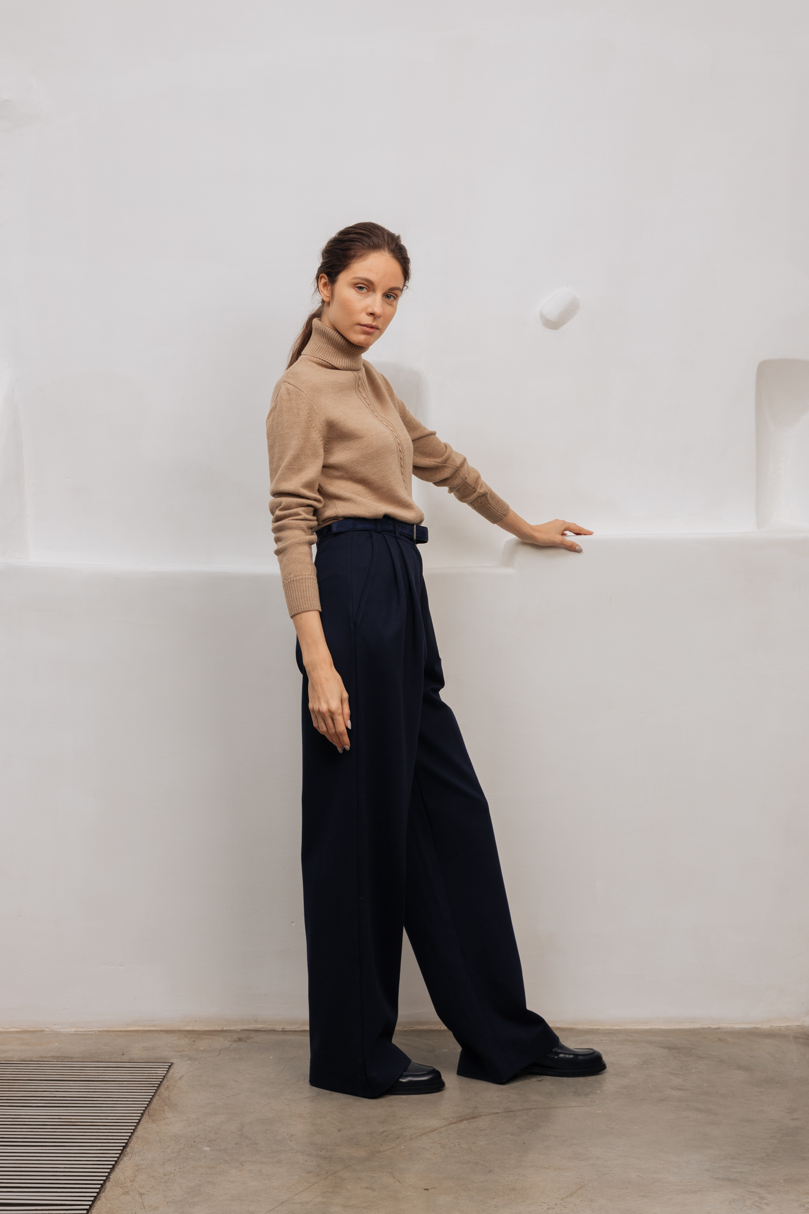 Брюки с высокой талевой посадкой, с глубокими складками и удобными карманами. Спереди на подкладке, застёгиваются на молнию и кнопку/крючок. По спинке в пояс вставлена эластичная тесьма, для лучшего прилегания и желаемой свободы в талии.