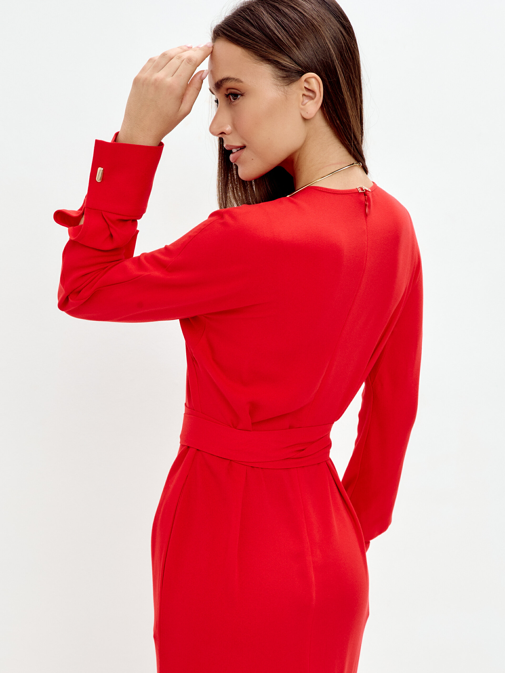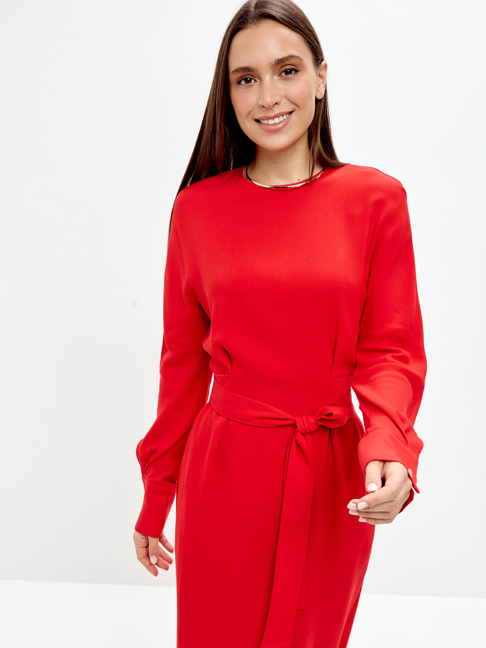 Цвет выходит на первый план - потрясающий, пламенеющий коралл! Мягкий полуприлегающий силуэт платья с долей свободы.