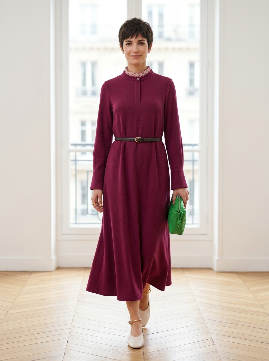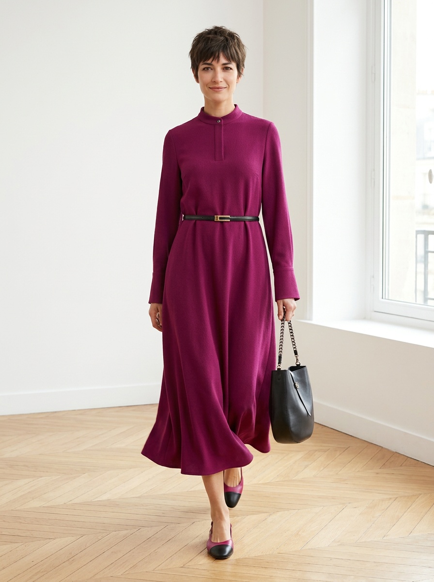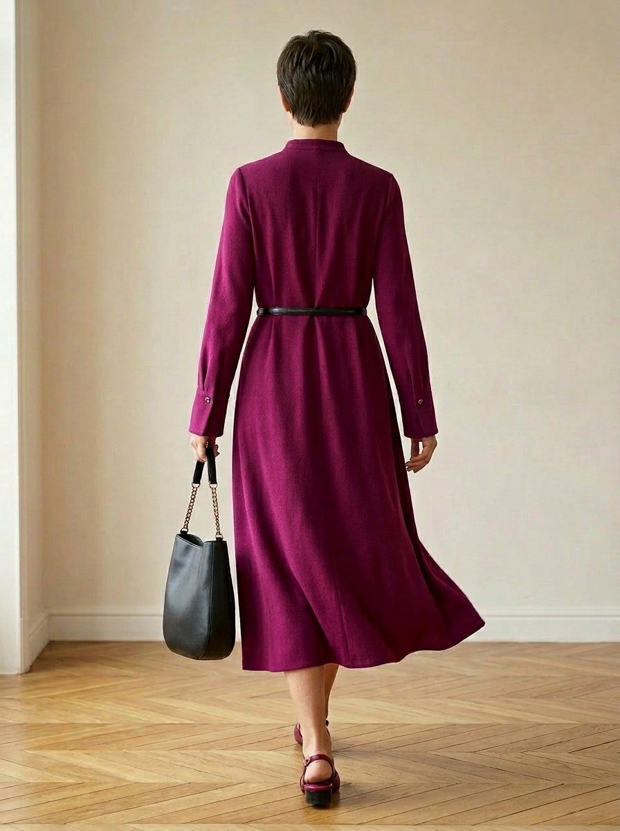 Застежка платья лаконична: всего одна пуговка на стойке воротника. Никаких лишних деталей, которые отвлекают от главного — от вашего цвета и вашей энергии.