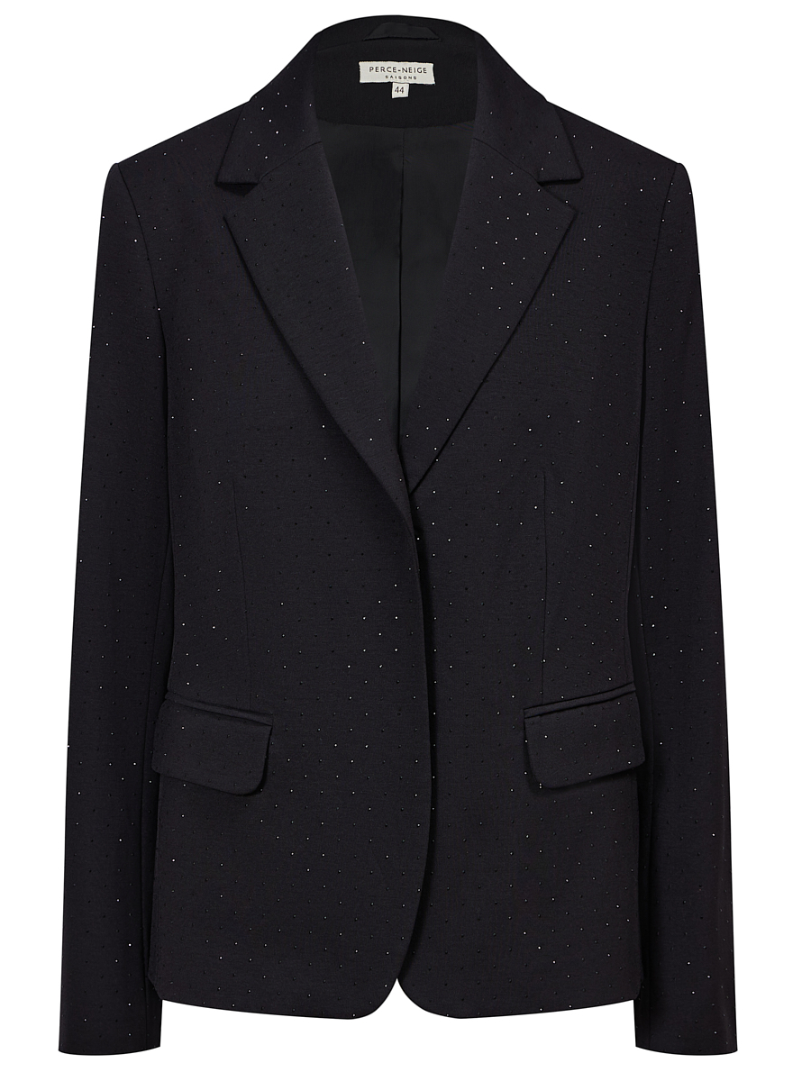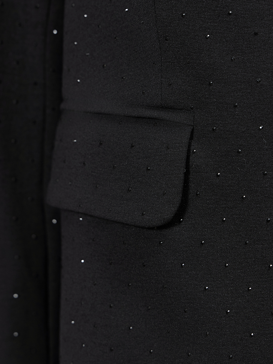 Главная особенность модели — декорированная множеством мелких стразов. Они создают эффект мерцания и придают жакету по-настоящему праздничный и роскошный вид. Удобная застежка на две скрытых кнопки завершает лаконичный дизайн.