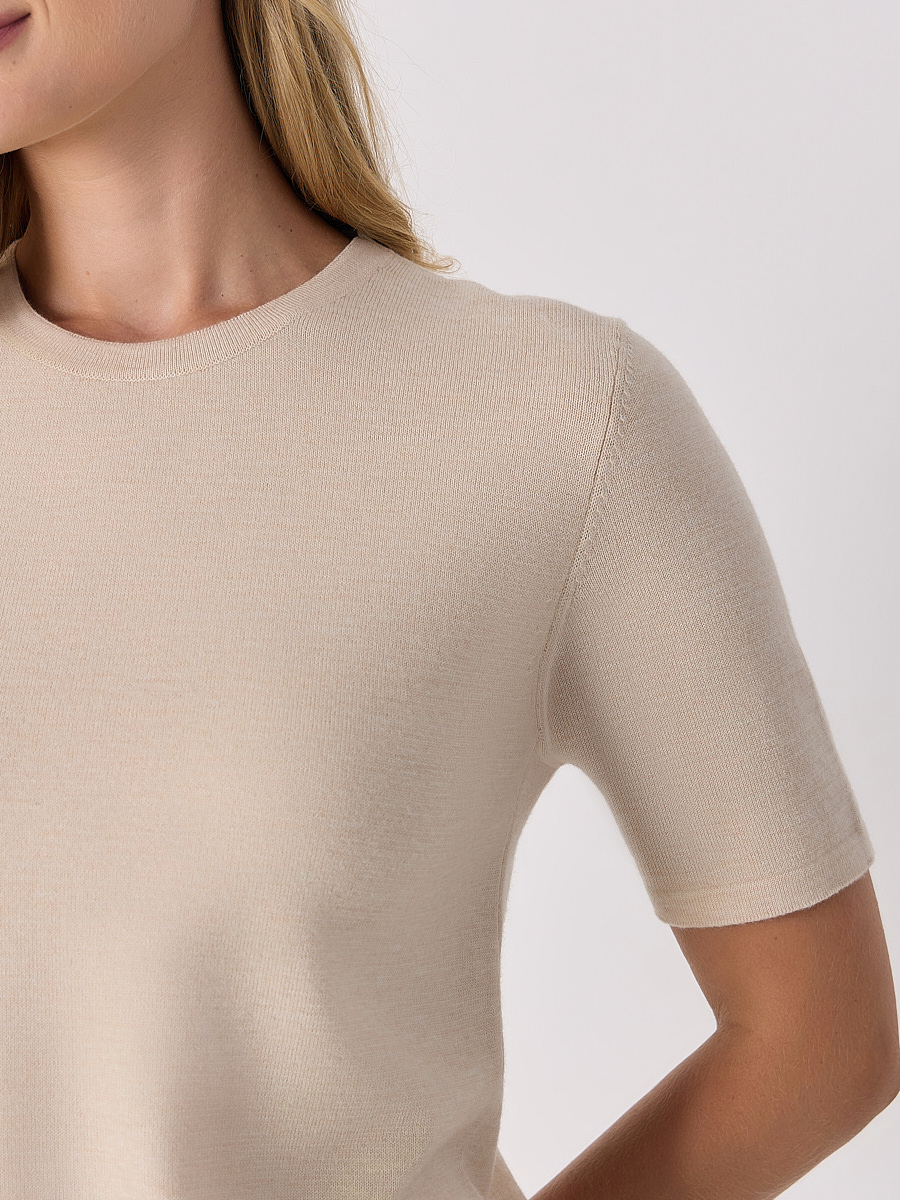 Бежевый джемпер из нежной шерсти мериноса от PERCE-NEIGE. Модель полуприлегающего кроя с короткими рукавами, круглым вырезом горловины. Джемпер дополнит базовые повседневные образы с брюками, юбками или джинсами.