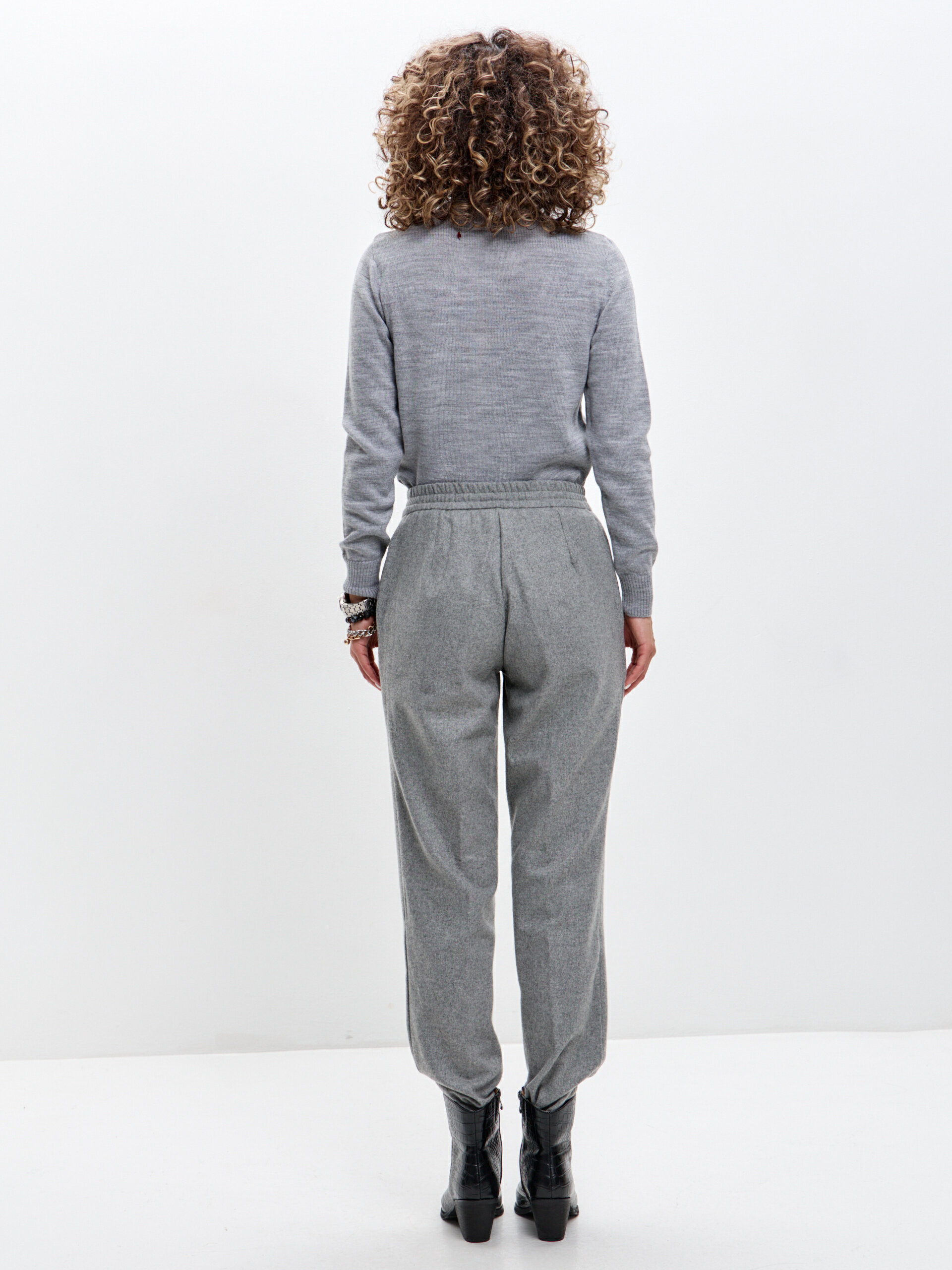 Посадка талевая, силуэт свободный по бедру и сужается к низу, свободно облегая ноги. Эластичный пояс аккуратно обхватывает талию, без давления. Брюки застёгиваются на молнию и кнопку/крючок. Удобные карманы с отрезным бочком, отутюженные стрелки добавляют вертикаль.