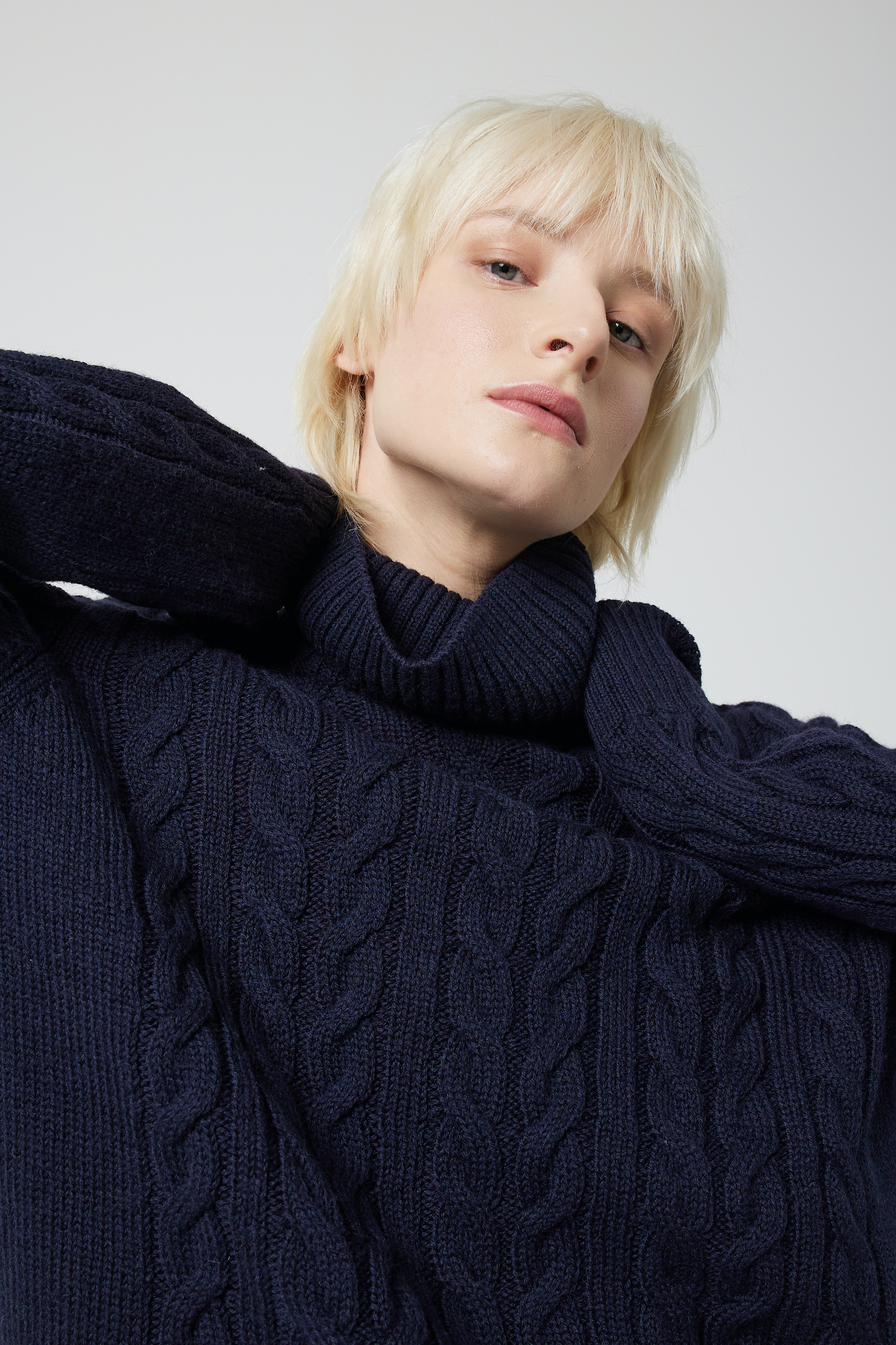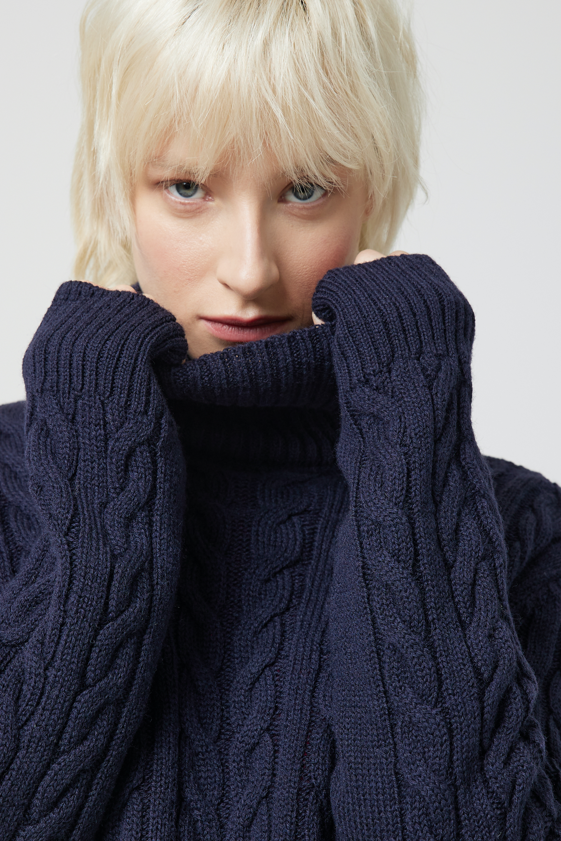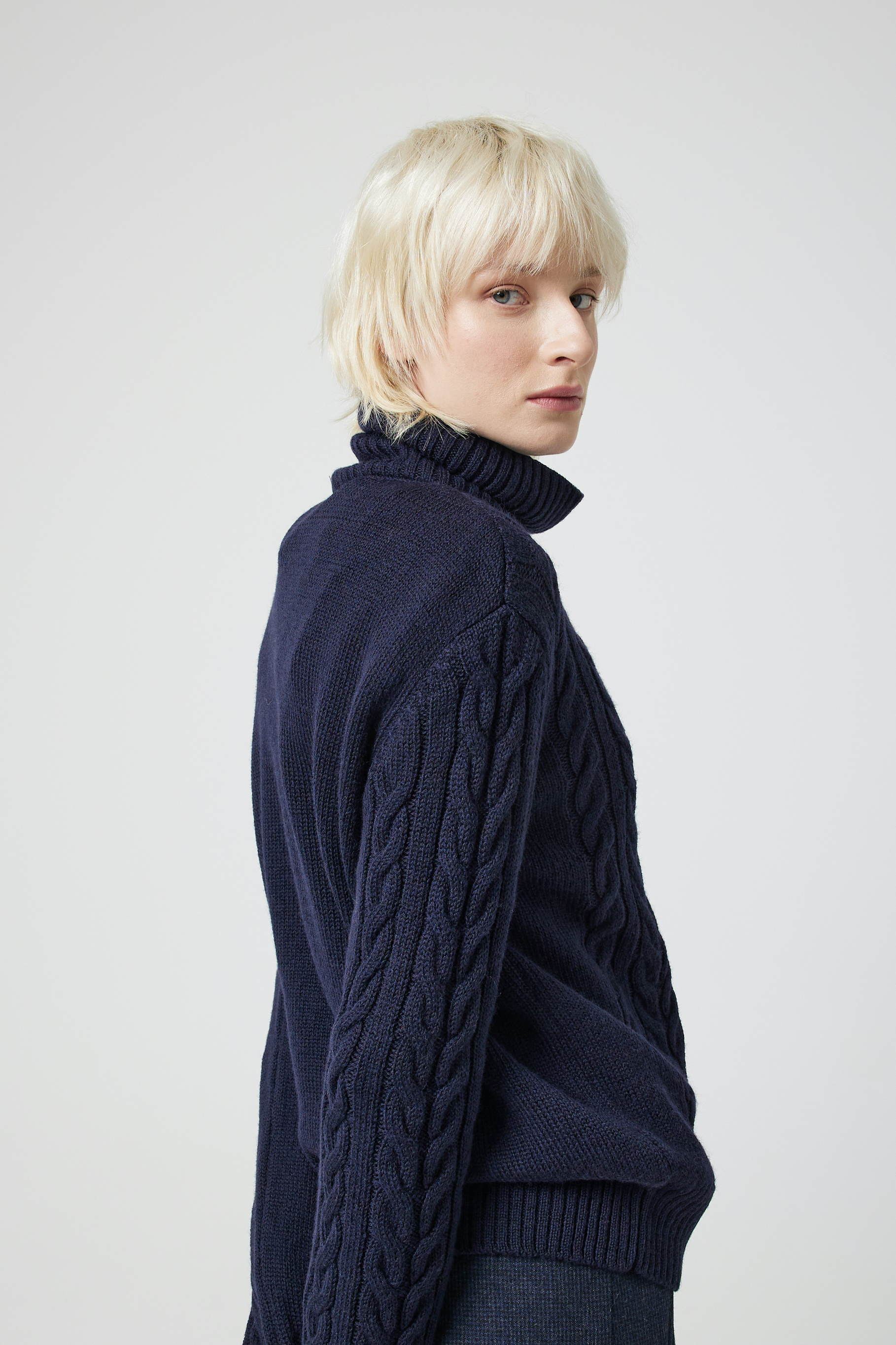 Свитер представлен в двух цветах, чернильно-синем и песочном.