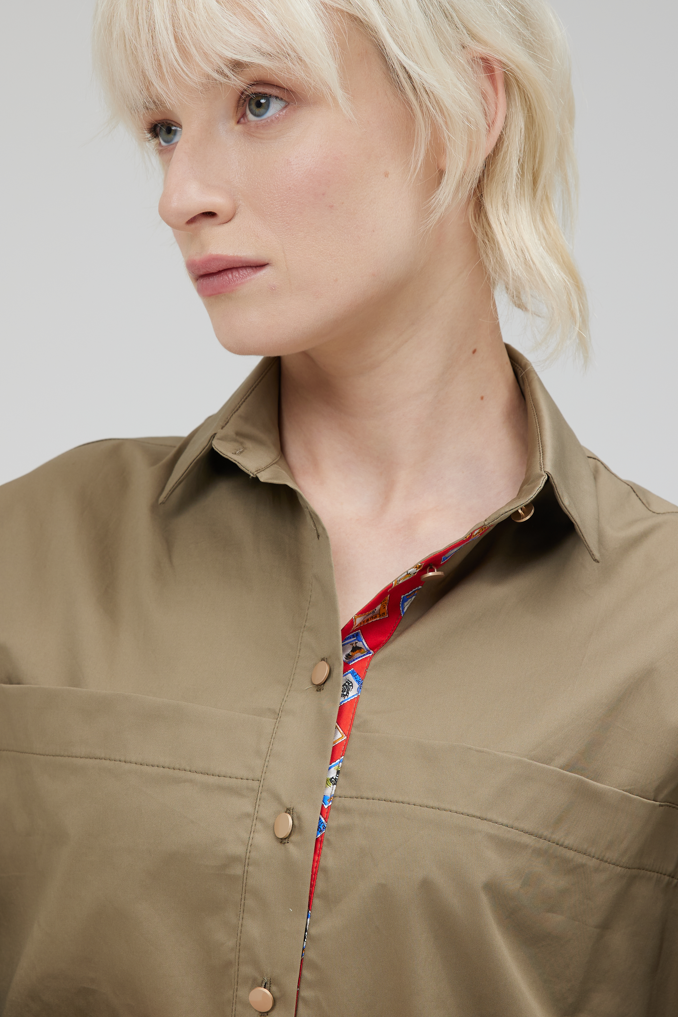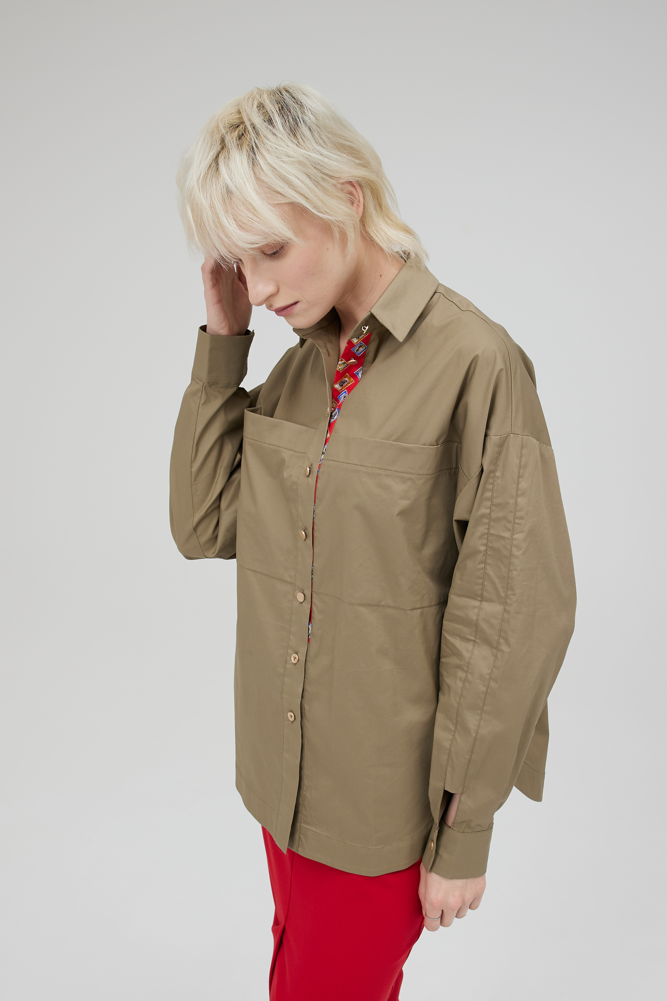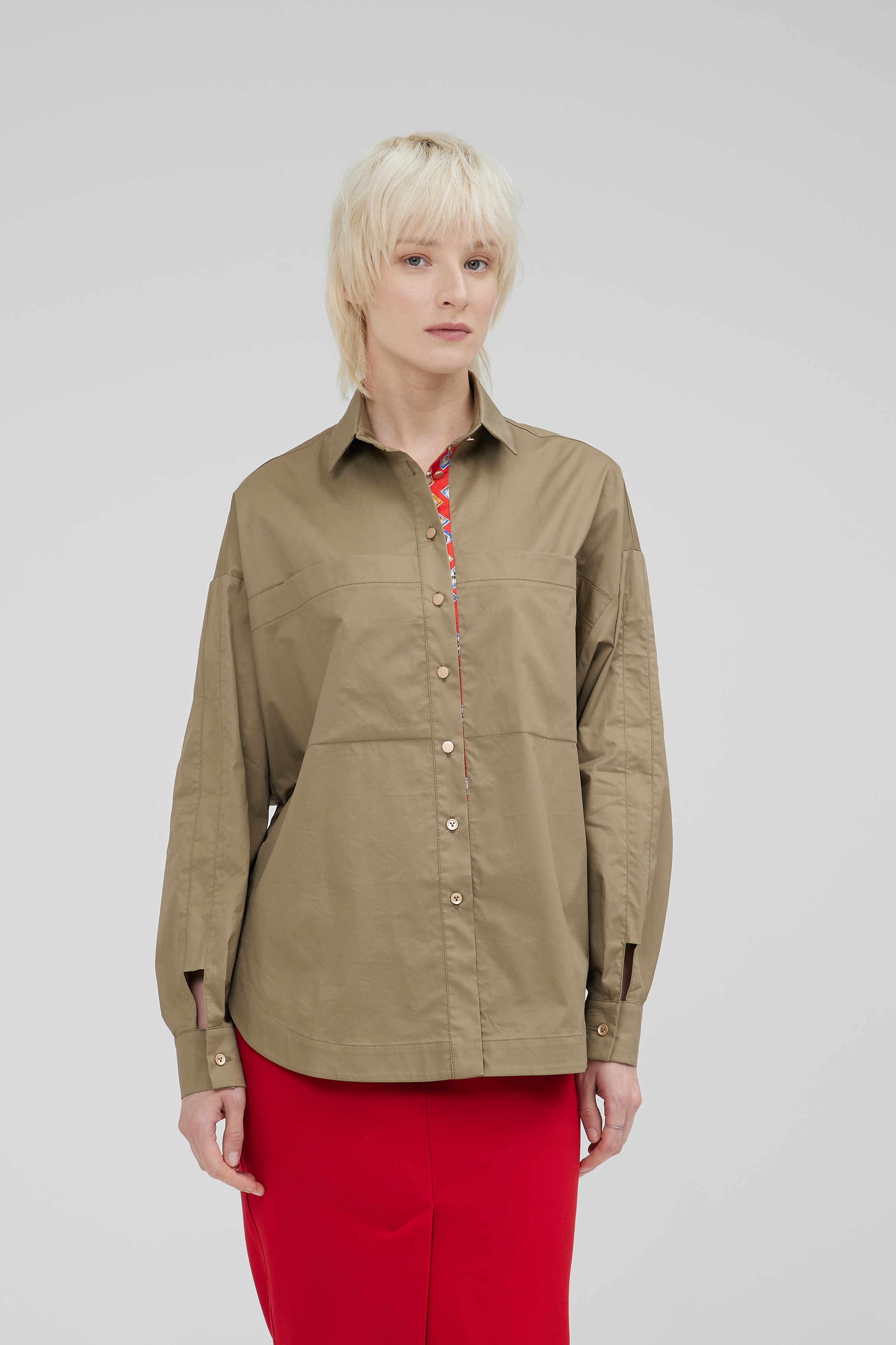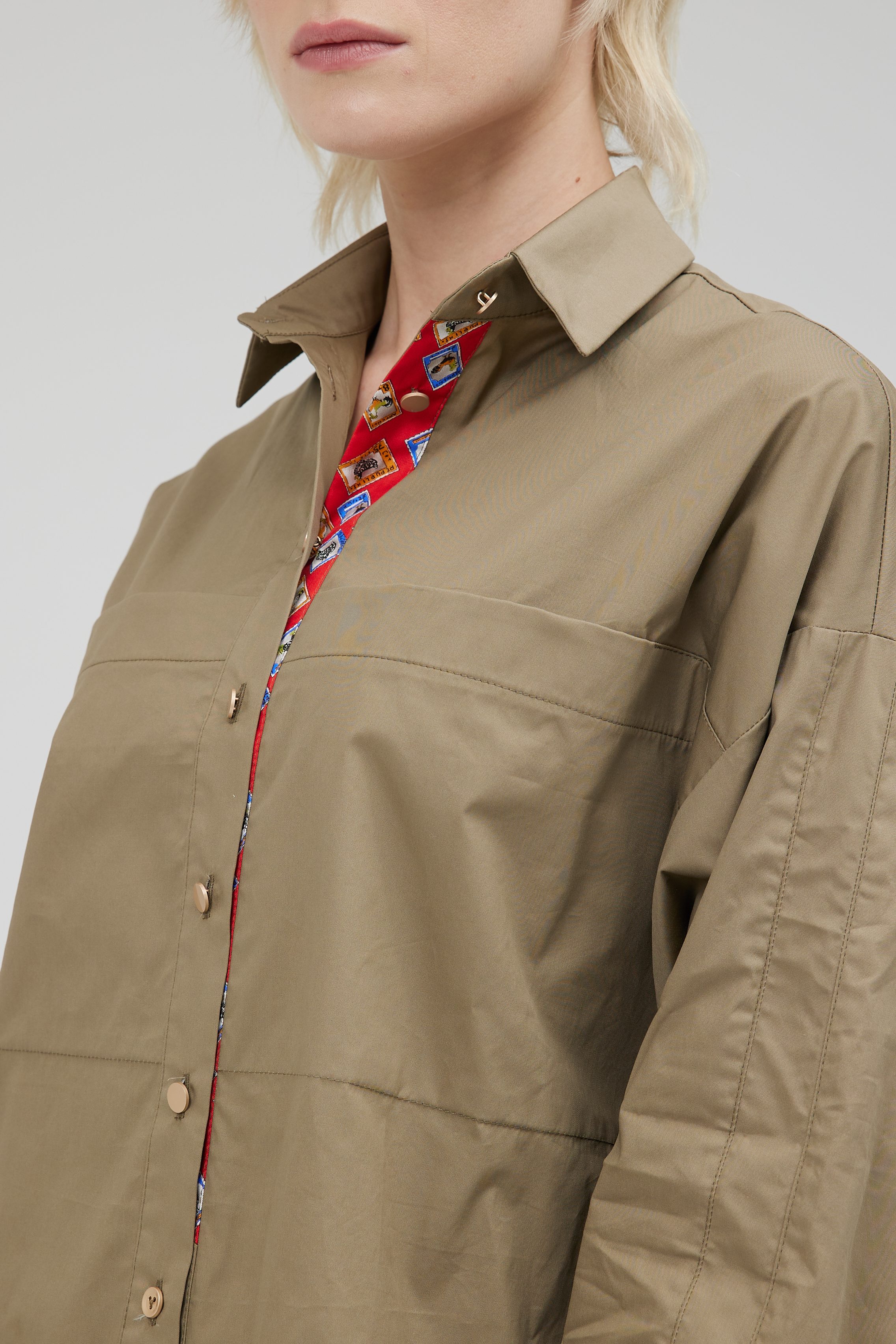 Отличная блуза по крою и исполнению. Крой ромбом, излюбленный в моде. Выполнена из итальянского хлопка Max Mara. Отделка планки натуральный шёлк. Блуза полностью натуральная и будет мяться естественно, в ней вы будете чувствовать себя в центре внимания, спокойный и тренд этого года хаки с алой отделкой в планке, создадут сочетание силы и динамики.