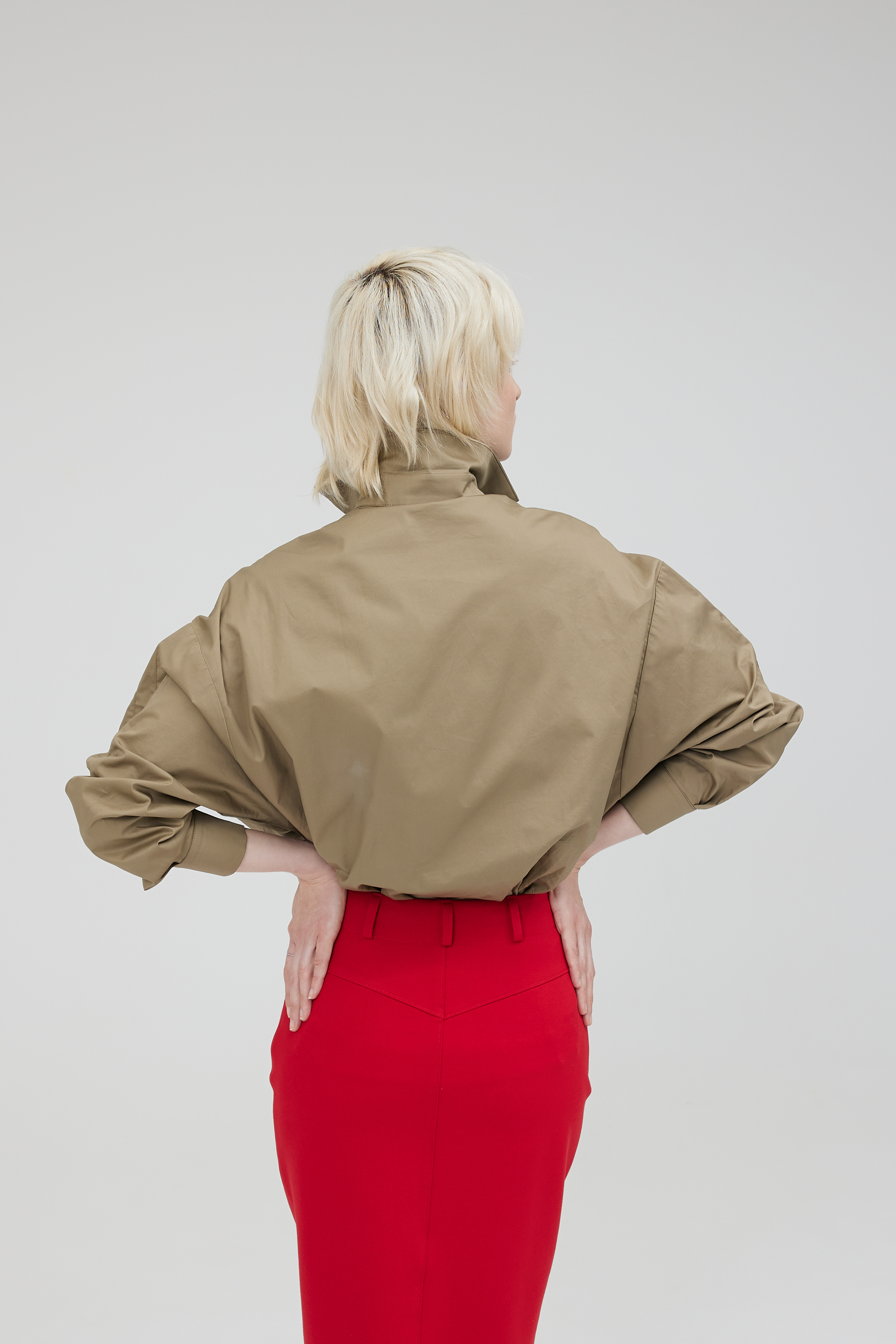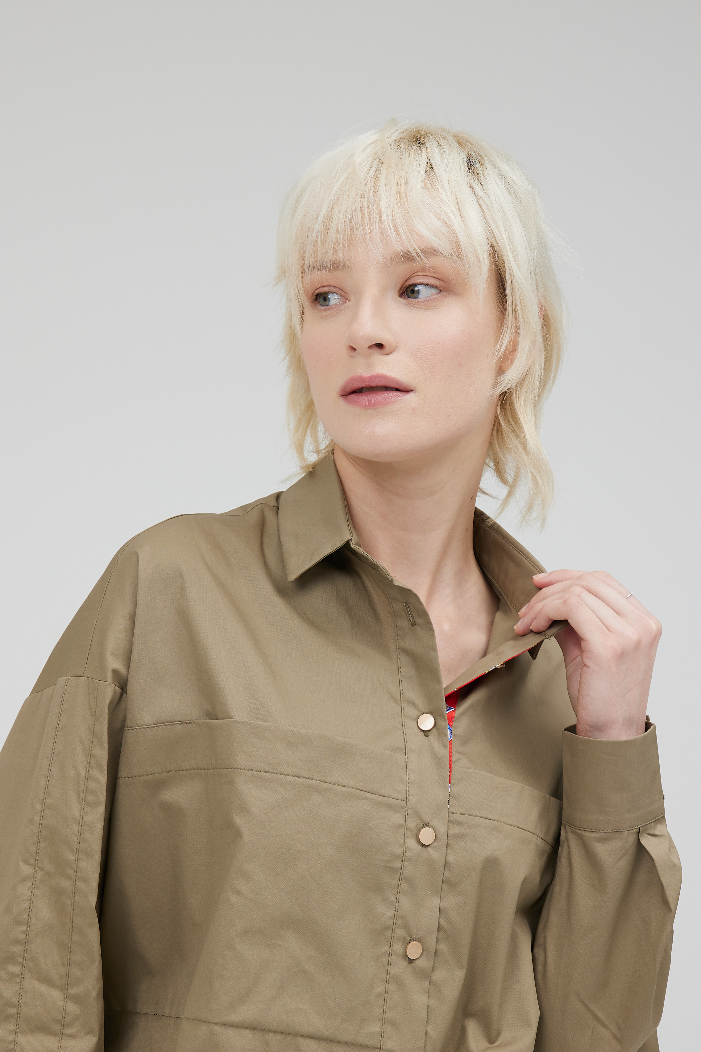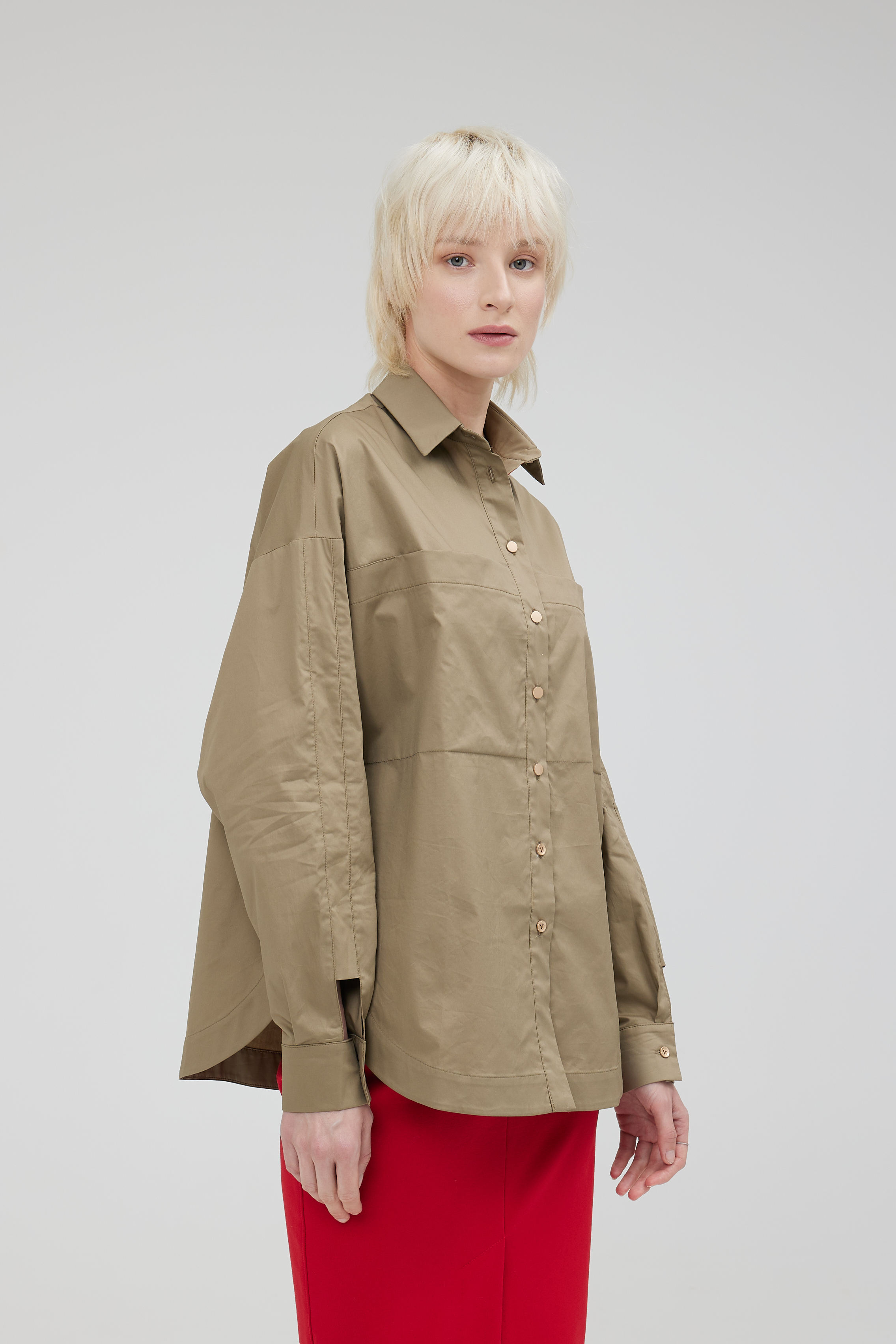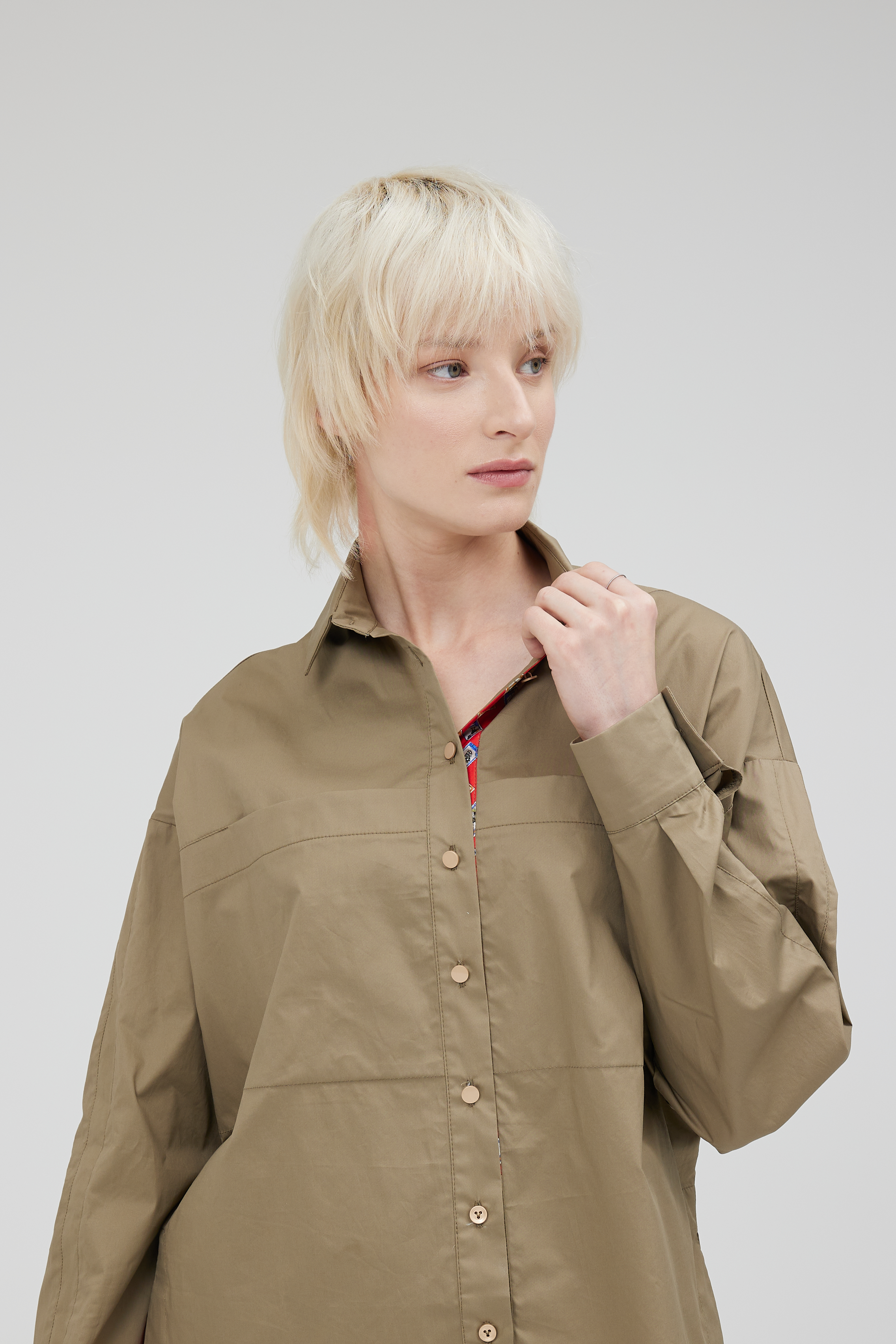 Отличная блуза по крою и исполнению. Крой ромбом, излюбленный в моде. Выполнена из итальянского хлопка Max Mara. Отделка планки натуральный шёлк. Блуза полностью натуральная и будет мяться естественно, в ней вы будете чувствовать себя в центре внимания, спокойный и тренд этого года хаки с алой отделкой в планке, создадут сочетание силы и динамики.