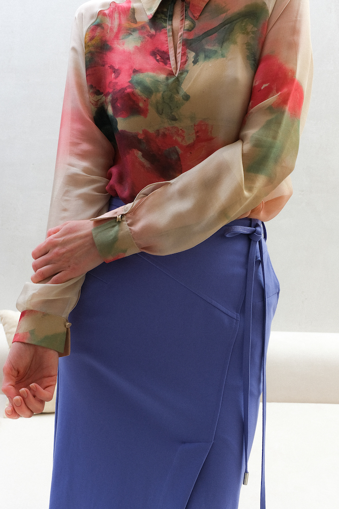 Шелк требует к себе особого отношения во всём – от кроя до эксплуатации. Все срезы мы тщательно обработали самым деликатным запошивочным швом. Инструкцию по уходу за блузой вы найдете внутри упаковки.
