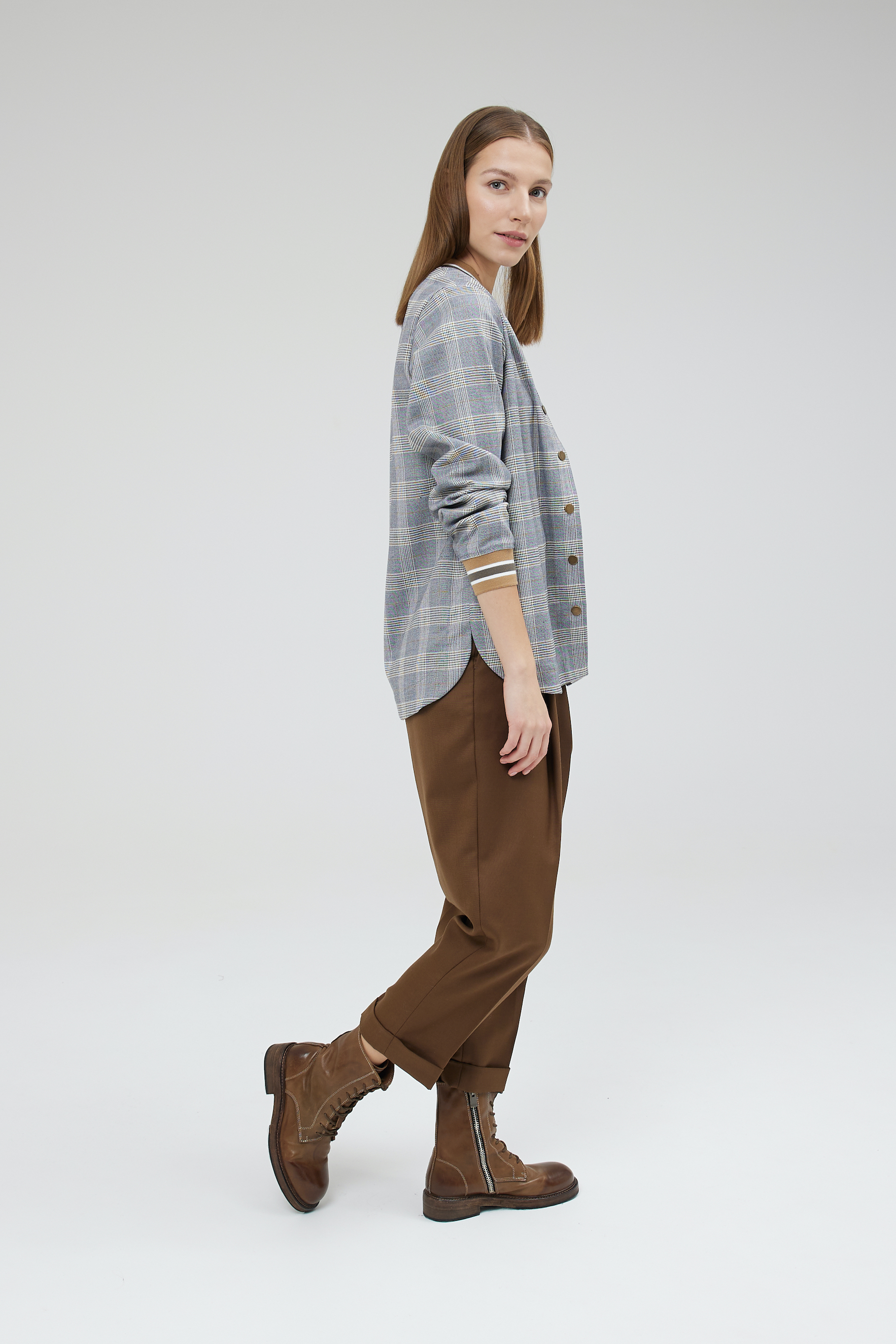 Прекрасная клетка “Принц Уэльский”, на молочном фоне играют тёмно-синий и коньячные оттенки. Прямой силуэт, с долей свободы. Чуть спущенное плечо, акцентные подвязы и кнопки цвета состаренной бронзато. Лекальный низ, коррелирует бедро и красиво оформляет боковую линию.