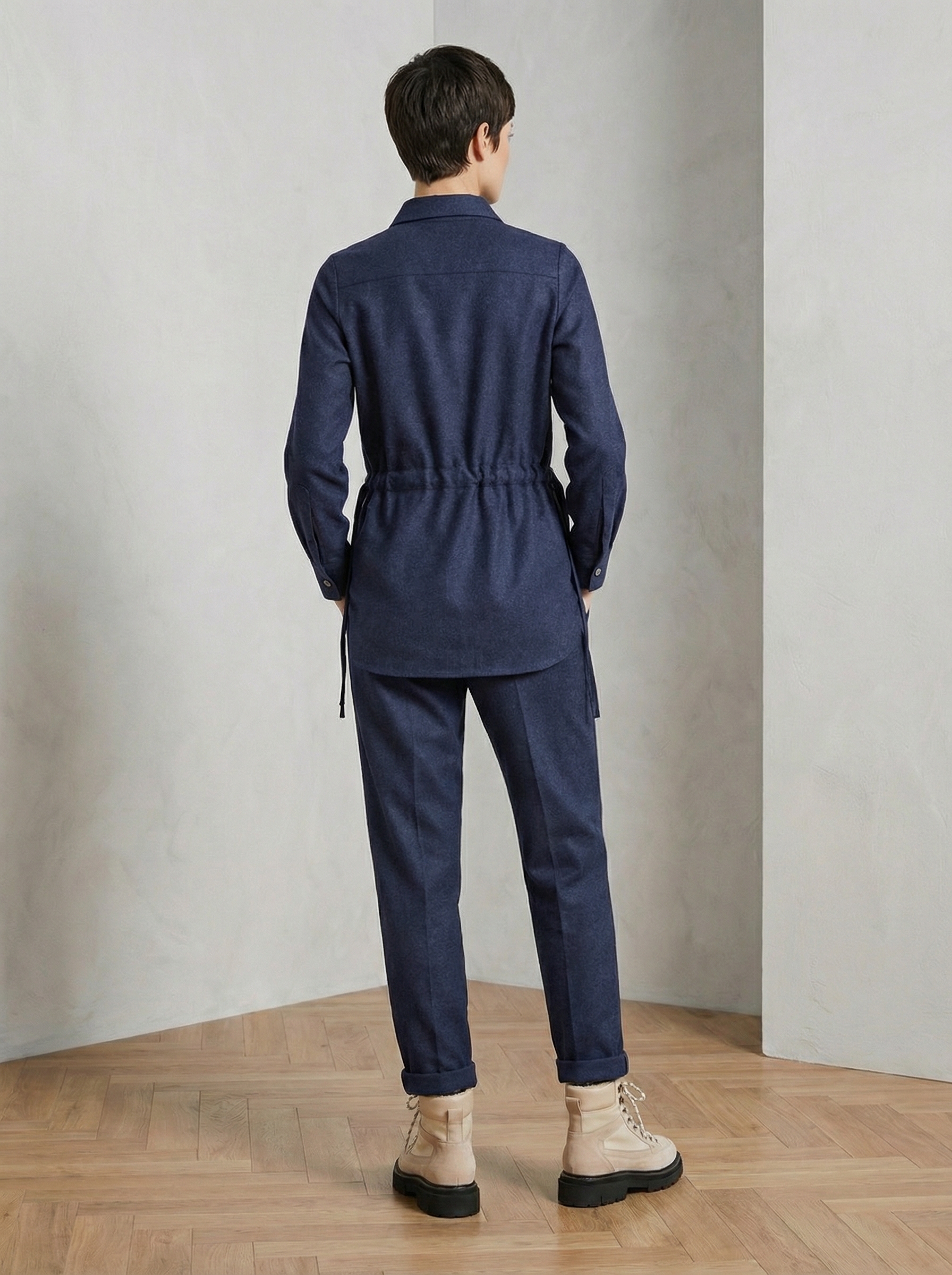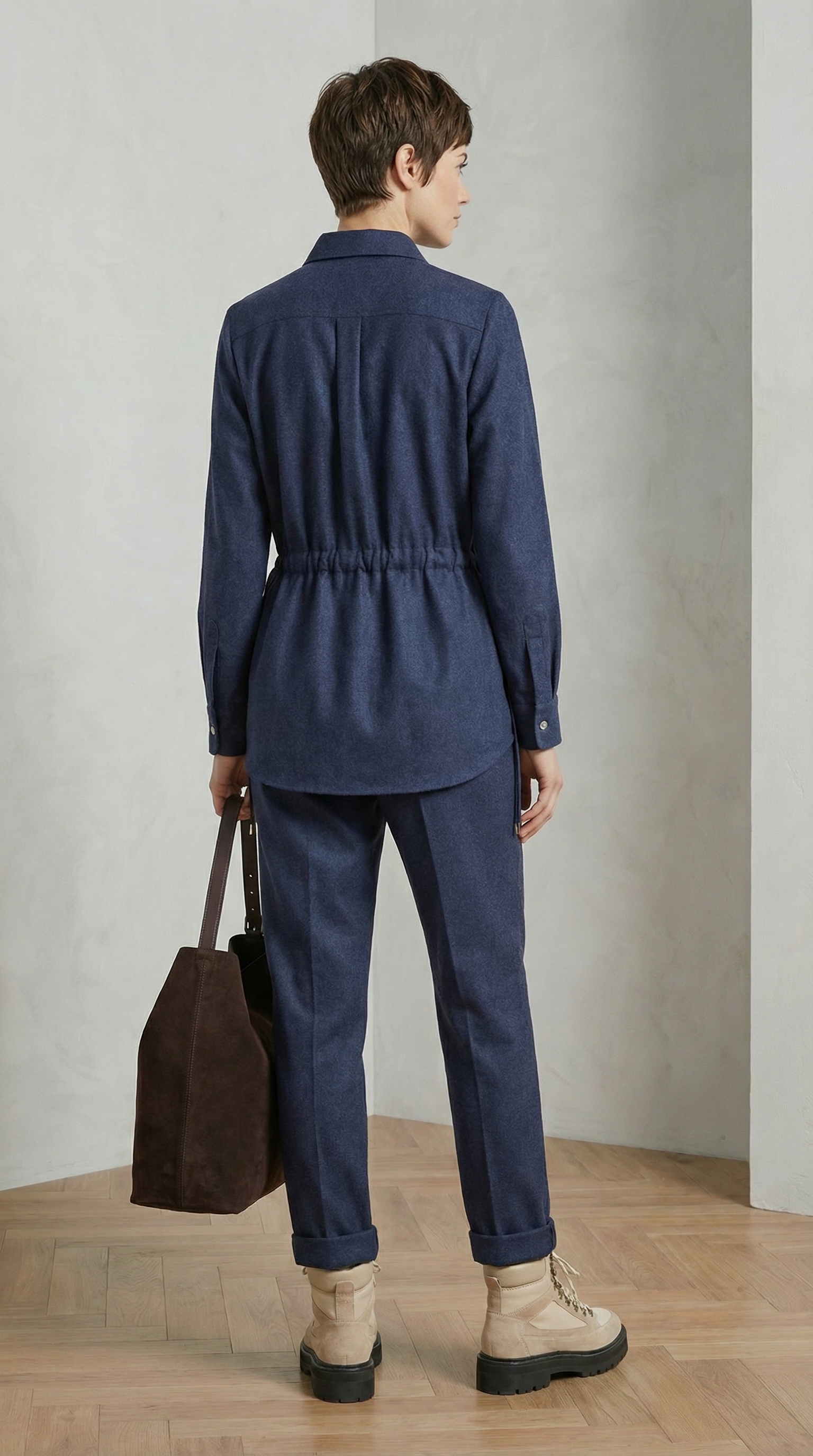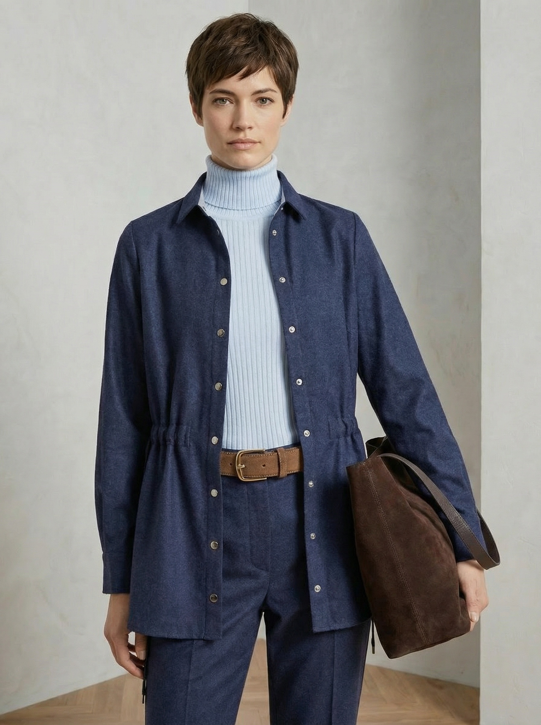 Силуэт А-образный, свободный. Плечо анатомическое, рукав в полную длину, завершается манжетой и шлицей, как в мужской рубашке. Длина рубашки до середины бедра, лекальный низ. На талии кулиса, с её помощью можно менять силуэт от приталенного до свободного. Комбинируйте с брюками Сhili, создавая костюм. Добавляйте в образ водолазку, футболку, вторую рубашку из хлопка.