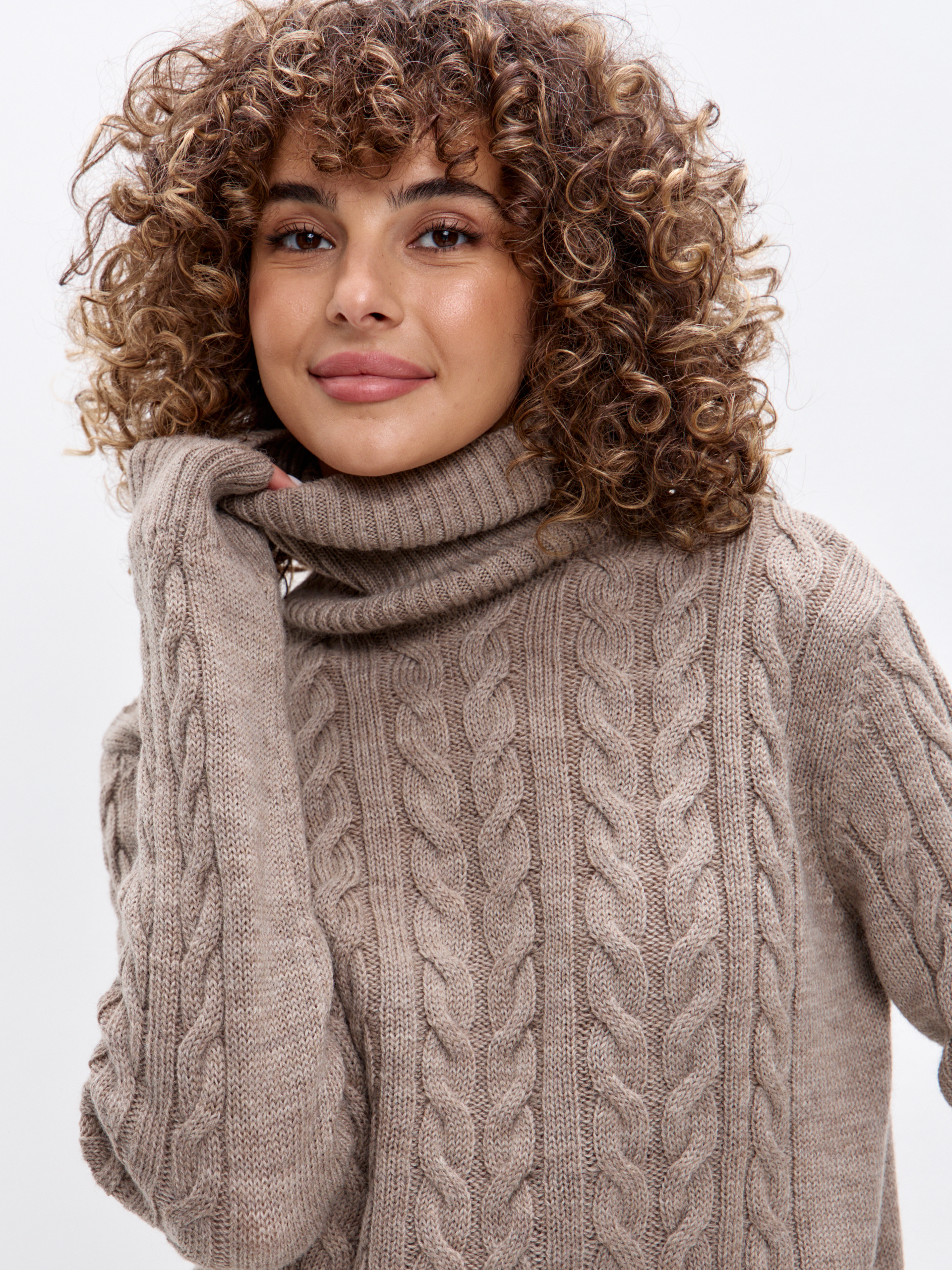 Дополнительный комфорт обеспечит высокий ворот, как у водолазки. Силуэт прямой, плечо спущено, рукав удлинён, можно сделать отворот.