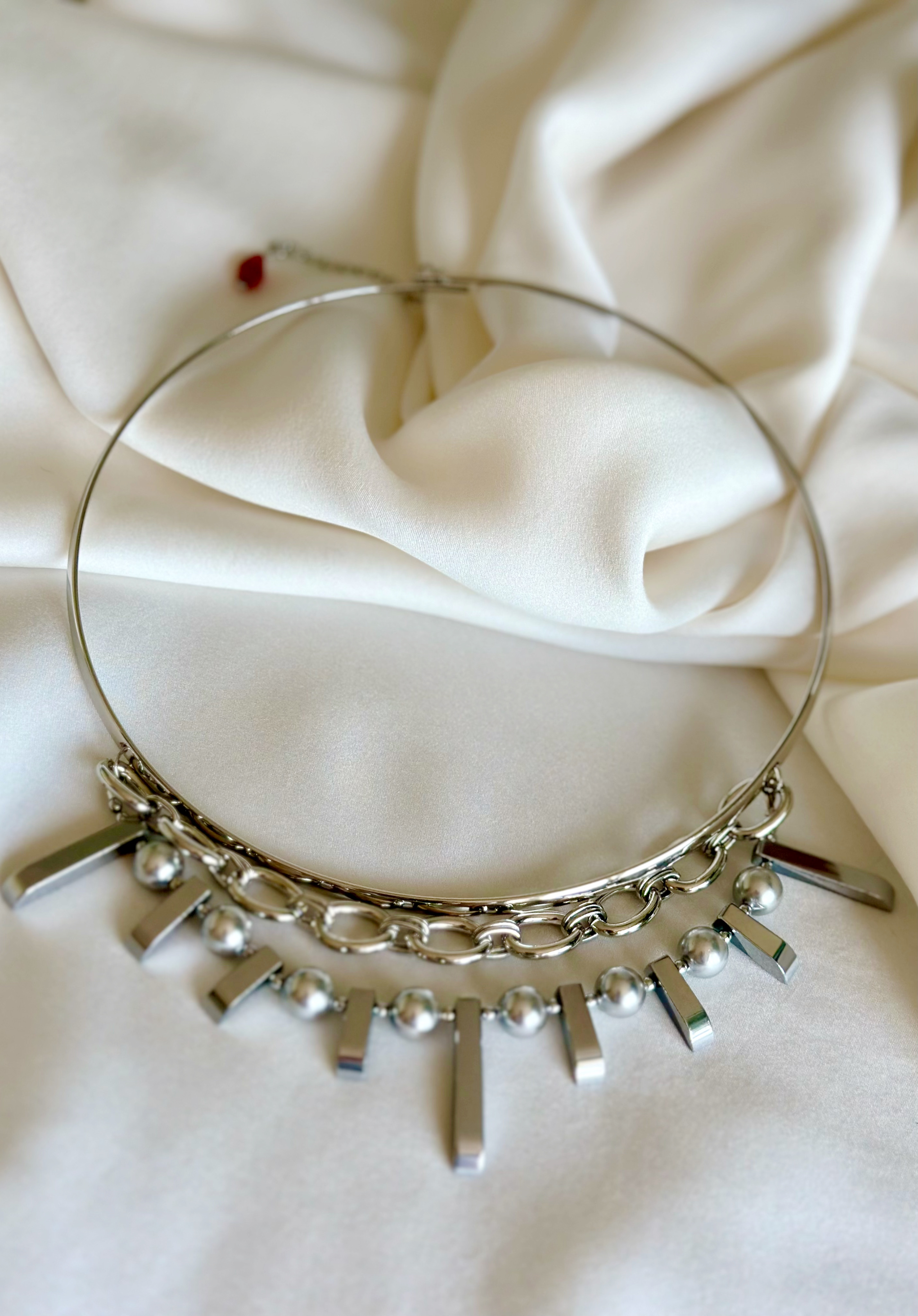 Тройной чокер, ровное основание из стали, дополнено цепью и серебристым жемчугом с гематитом.