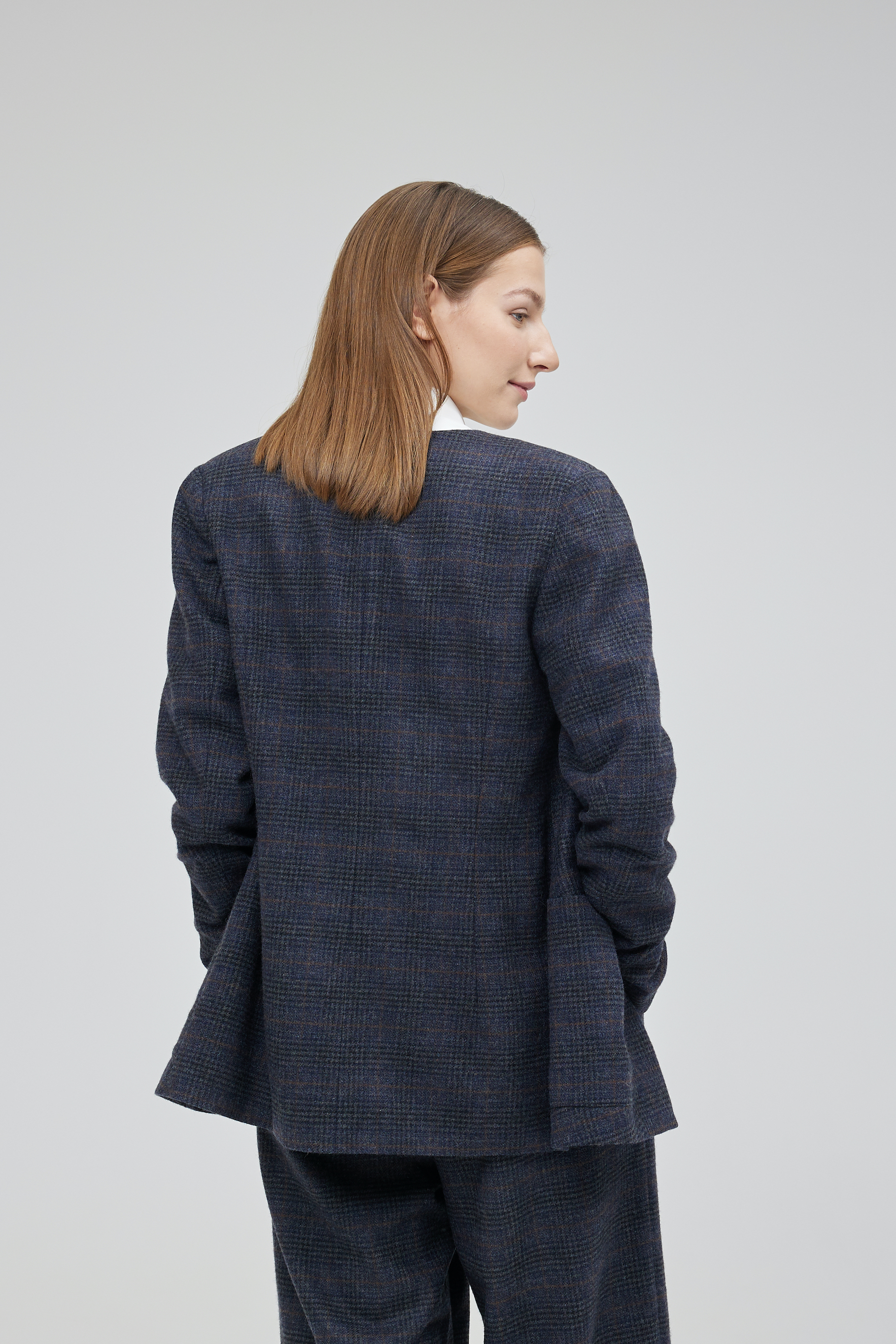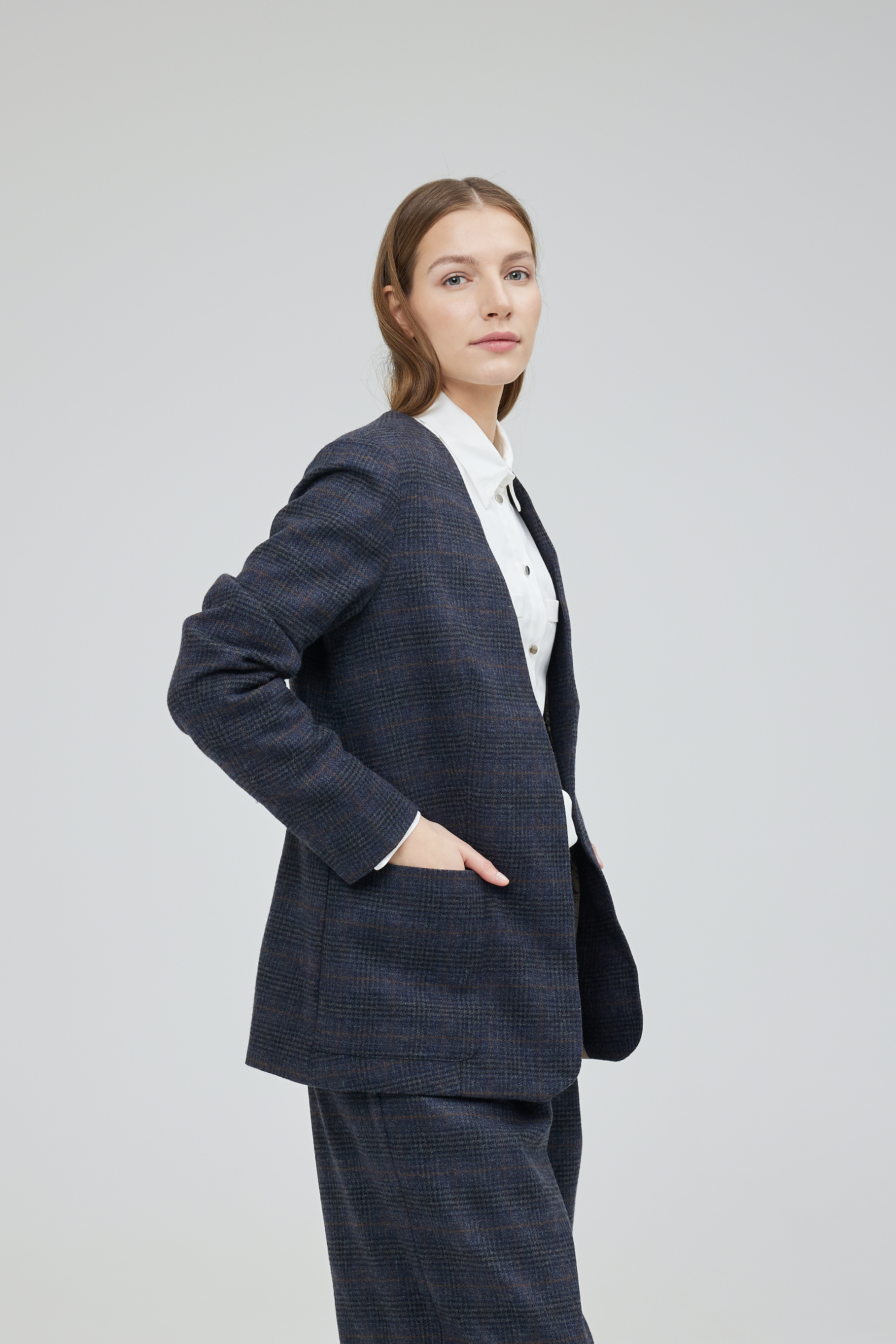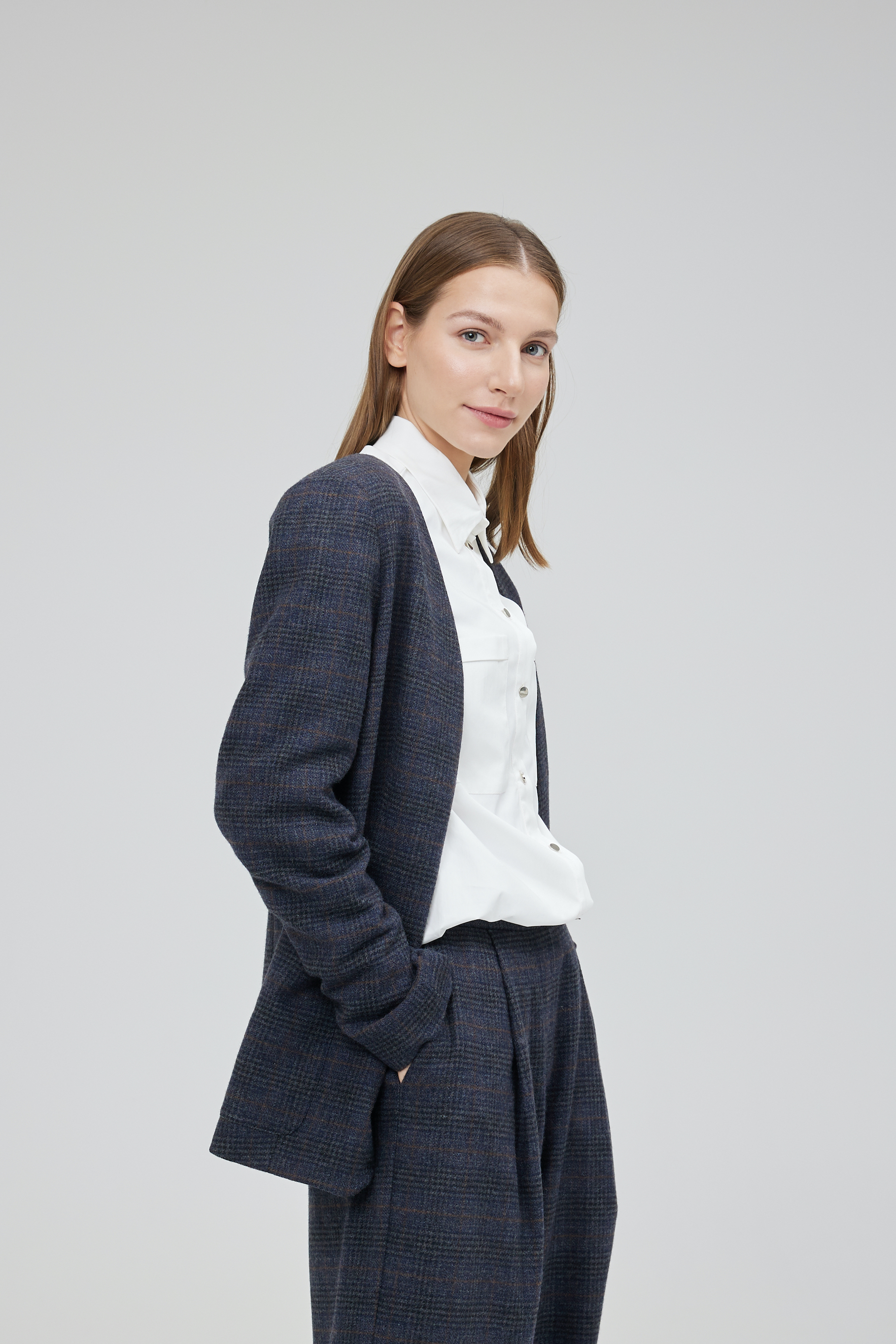 Силуэт жакета прямой, слегка приталенный, без явного эффекта owersize. Длина жакета 70 см. Накладный скруглённые карманы, вторят мягкому силуэту и ткани.