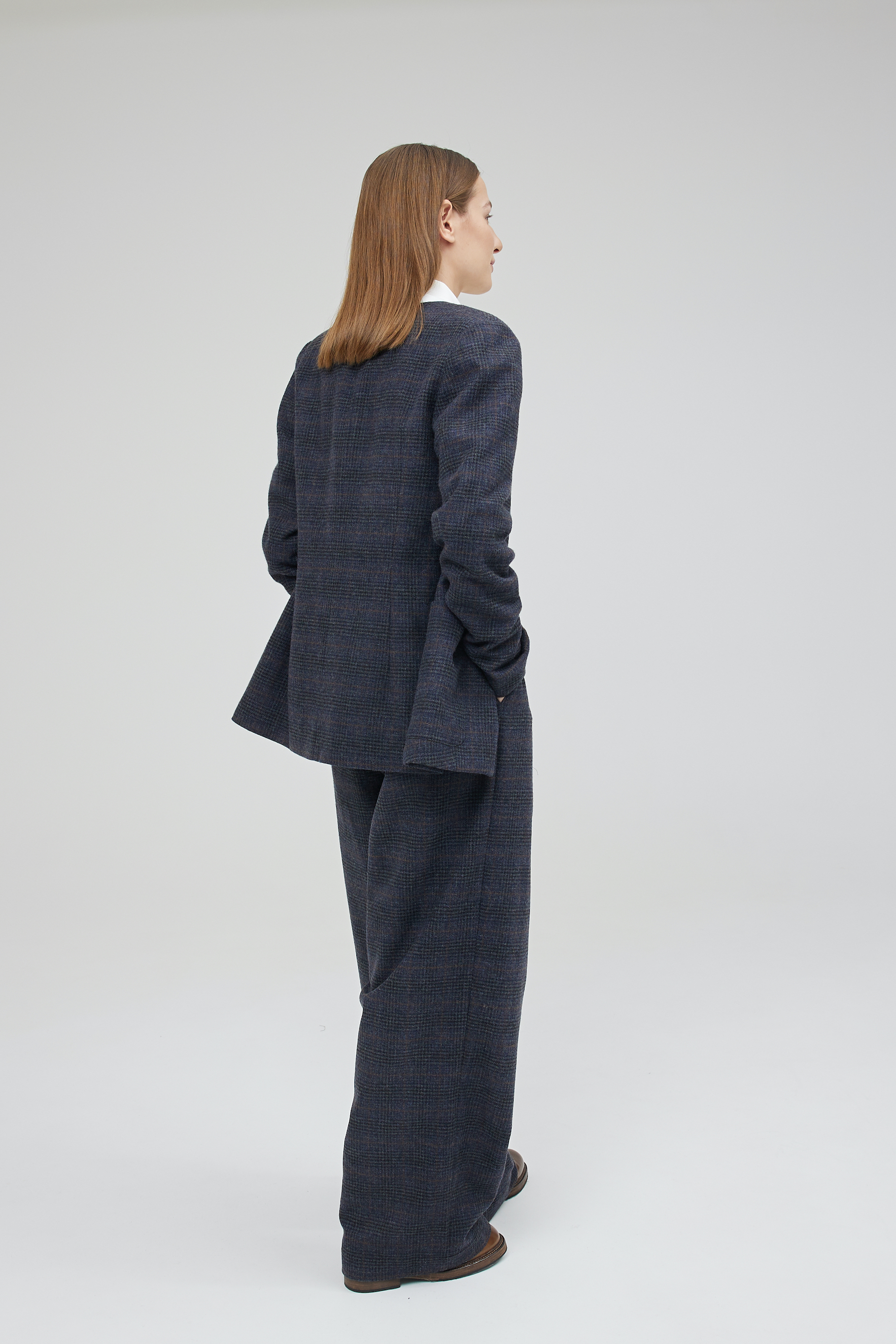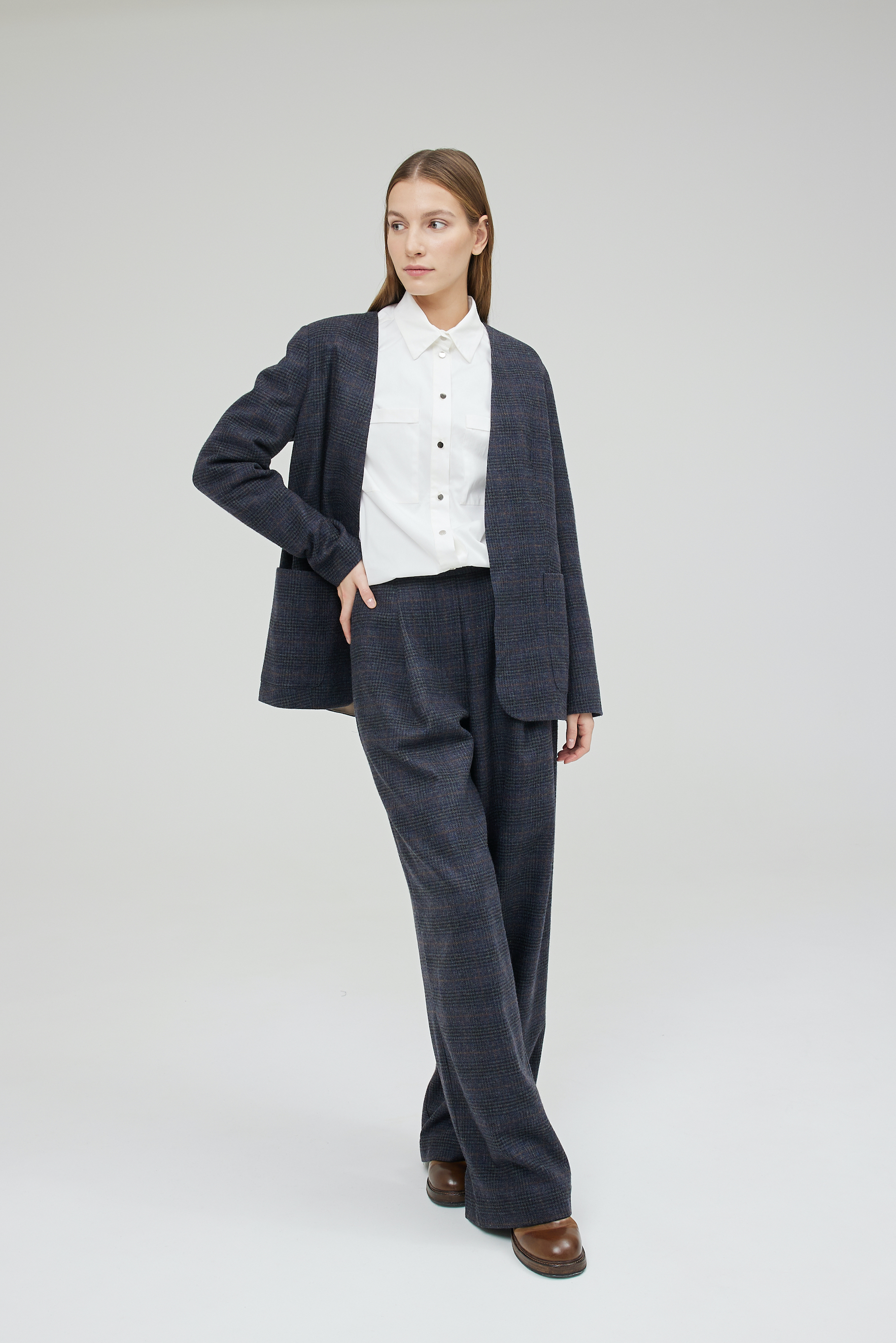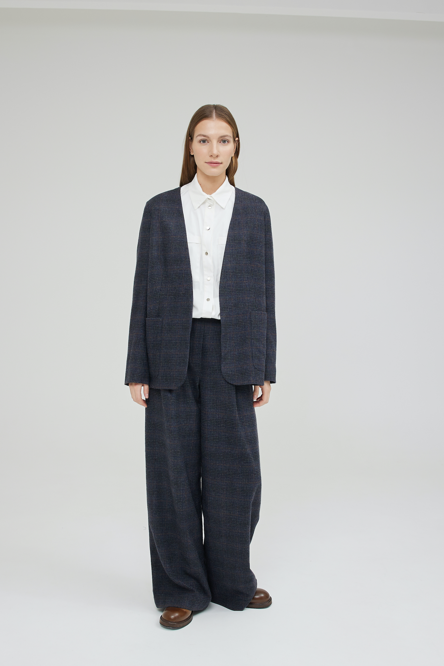 Силуэт жакета прямой, слегка приталенный, без явного эффекта owersize. Длина жакета 70 см. Накладный скруглённые карманы, вторят мягкому силуэту и ткани.